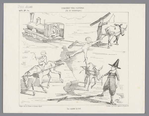 Editor: Here we have Johan Michaël Schmidt Crans's "Spotprent op het gelijktijdig indienen van een wetsontwerp op de spoorwegen door Heemskerk en Kappeyne," an engraving from 1875. It features two figures atop cartoonish locomotives... it’s quite a peculiar image. How do you read the imagery, especially considering the political context? Curator: Well, the trains immediately speak to the industrial revolution and its impact on Dutch society. But it's not just about technological advancement; the print is overtly political, deeply embedded in the debates surrounding railroad legislation and ministerial power in the 1870s. Note how one train bears destinations like "Haarlem," "Middelburg" and even "Leeuwarden" whilst the other says only 'Cabinet' and they proceed in a collision course. What statement do you think the artist is trying to make here? Editor: Perhaps he’s highlighting the potential dangers or clashes inherent in merging political ambitions with infrastructure development? The trains seem like metaphors for competing factions. Curator: Exactly. This image needs to be analyzed within the socio-political context of the period, specifically the struggles surrounding railway construction and the influence of various political groups and individual cabinet members, Heemskerk and Kappeyne as indicated by the title. How do you see this artwork functioning in public discourse at the time? Editor: I imagine it was quite effective. The caricature style and accessible symbolism likely made the political commentary easily digestible for the broader public. Curator: Precisely, functioning as a potent form of visual rhetoric within the public sphere, shaping and reflecting public opinion. It encourages us to investigate how societal factors influence art. It shows how railroads went from a neutral societal advancement into a polarized debate where sides had to be taken and potentially be ‘unsafe’ while in friendly partnership. Editor: It’s interesting to consider the multiple layers of meaning embedded in what at first appears to be a simple caricature. I definitely have more food for thought about the public role of art.