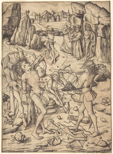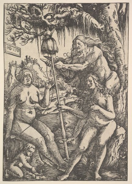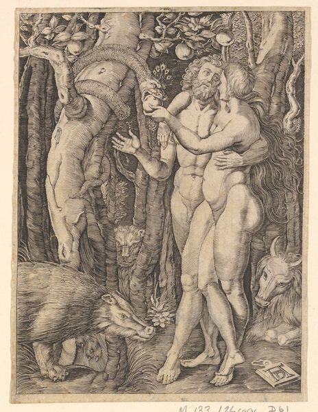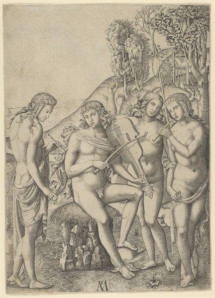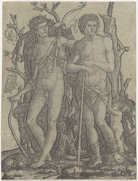 Editor: This is "Mars seated at the left, his left hand on Venus's shoulder, cupid beside her at the right," an engraving by Marcantonio Raimondi from 1508. It's an intriguing composition, almost like a stage play with carefully posed figures. What’s your interpretation of this scene? Curator: What I find compelling is how Raimondi appropriates and reframes classical mythology. The work reflects the Renaissance fascination with antiquity, yet it's not a simple revival. It's an active engagement with these inherited narratives. Look at Mars: disarmed, his armor cast aside, seemingly captivated by Venus. It subverts the conventional image of Mars as an aggressive, masculine figure, presenting a more nuanced, perhaps even vulnerable, portrayal of power dynamics in relation to love and beauty. How does this challenge traditional views of masculinity, in your opinion? Editor: I see your point. The traditional view of Mars, the god of war, is completely disrupted here. The weapons on the ground speak volumes. What's with cupid touching Venus' leg, though? Curator: I'd argue that cupid challenges power relations, he is an agent of disruption. Consider that cupid often is seen as a symbol of irrationality and passion, subverting calculated plans of war with unexpected shifts in power and gender roles. How does the placement of the characters, then, influence your analysis? Editor: Well, Venus looks to be ignoring Mars. This isn't necessarily about love between two equals, and she's centered in the picture plane. She seems very deliberate and self-possessed. I hadn’t considered how radical this engraving is in its depiction of women, who often appeared in art from this time as the muse rather than the main event. Curator: Exactly. These nuances highlight that "Mars seated at the left, his left hand on Venus's shoulder, cupid beside her at the right," isn’t a mere illustration, but a re-evaluation. It offers an important discourse on identity and social norms during the Renaissance, urging us to rethink entrenched biases about power and love even today. Editor: This really encourages a fresh reading of well-known mythological tropes and Renaissance norms. Thank you for the context.
