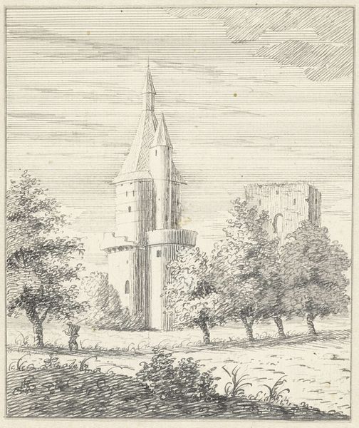 Wenceslaus Hollar created this River Landscape with a View of Rhenen using etching techniques. The composition is distinctly divided into three horizontal bands. The foreground shows an elevated land mass, intricately detailed with cross-hatching to denote texture and depth. The middle ground features the town of Rhenen, punctuated by the dominant verticality of its church tower, balanced by sailing boats on the river, which introduces dynamism. Finally, the background fades into a lighter tone, suggesting atmospheric perspective, and the sky is left relatively empty. This approach divides the composition into distinct, readable signs. The landscape elements are not merely representational but work together to structure our reading of the image. The clear lines and structured layout invite us to consider how Hollar uses form to create a sense of place, but also to engage with broader concepts of space and representation.