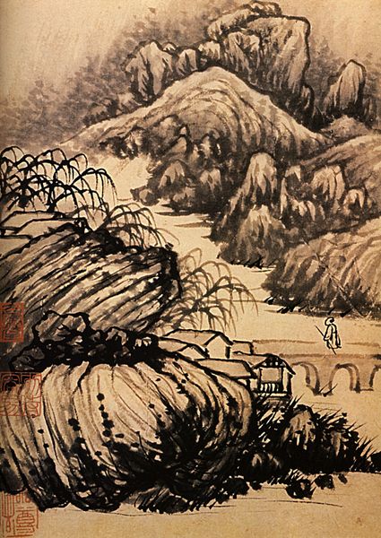 "Nostalgic Walk" is a poignant ink and color on paper work by Shitao, created during a period of immense social upheaval in China. Shitao, a member of the Ming Dynasty imperial family, lived through the Manchu conquest, which led to the establishment of the Qing Dynasty in 1644. The painting depicts two figures in a landscape; the imagery subtly reflects the artist's complex negotiation of identity and allegiance. Shitao turned to painting and poetry as ways to express his longing for a bygone era, embedding a deep sense of personal history and cultural memory into his art. Consider the emotional weight of Shitao's choice to represent figures in contemplation amidst nature. Is it an exploration of personal grief and resilience, or a broader commentary on cultural loss and adaptation during a time of dynastic transition? The painting resonates as a quiet yet powerful statement of resistance.