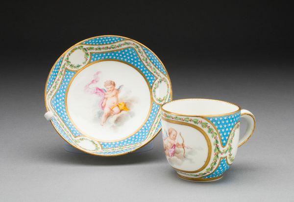 Curator: Looking at this “Cup and Saucer,” made around 1760 by the Manufacture nationale de Sèvres, currently residing here at the Art Institute of Chicago, what springs to mind for you? Editor: My initial impression is that of a playful opulence—a whimsical design intended for aristocratic leisure, I presume. It’s a striking display of the Rococo style. Curator: Precisely! Notice the soft, asymmetrical curves and the pastel color palette, iconic of the period. Beyond its aesthetic appeal, the creation of this porcelain set involved highly specialized labor, from the mining of kaolin to the meticulous hand-painting. Editor: Yes, the materiality is essential here. Sèvres porcelain was a carefully guarded secret; the production, a symbol of French economic and artistic power. Examining it materialistically, the gold trim and delicate brushwork signify not only artistic skill, but also the vast resources funneled into producing luxury goods. Consider the contrast: lavish display supported by, quite probably, arduous working conditions for the artisans. Curator: Absolutely. But from a formalist perspective, the cup and saucer's interplay of line, color, and form creates a harmonious whole, doesn't it? The miniature landscape scenes, framed by these curvilinear reserves, become visual poems. Editor: They are visually appealing. Yet, what interests me is how these miniatures served to construct aristocratic identity—signifying taste, refinement, and the ability to consume luxury items. Curator: I appreciate your point about consumerism. Ultimately, its survival underscores an aesthetic ideology but is fundamentally underpinned by labor and market dynamics of 18th century France. Editor: Indeed. And I am fascinated by how such a seemingly fragile object tells the tale of industry, skill, and perhaps even social inequality in Rococo France.