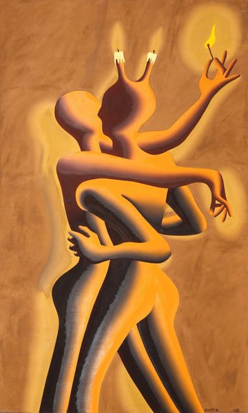 Curator: The way the brushstrokes are smoothed in René Magritte's "Les jours gigantesques", made with oil paint in 1928, lends this piece a dreamlike and unsettling feeling. What’s your first take? Editor: Disquieting indeed! There’s a strange stillness. The muted colors – primarily browns, tans, grays – combined with the somewhat coarse, almost blocky figures give it a sculptural weight but also a disconcerting intimacy. It feels almost oppressive, doesn't it? Curator: Absolutely. Considering the title, translated as "The gigantic days", it compels us to explore gender dynamics of the era, reflecting themes of dominance and objectification evident in the intertwined bodies, the woman naked, the man clothed, the almost brutal grasp. We must interrogate what societal narratives and power imbalances this tableau exposes, particularly within the context of the surrealist movement. Editor: And to look closer at Magritte’s material choices, the layering of oil paint seems deliberately uncomplicated. This simplicity is not accidental. Rather than attempting photorealism, he directs attention to the conceptual clash. The disjuncture created through the uncanny combination of textures —flesh and fabric—pushes at conventional definitions of beauty, disrupting normative consumption patterns related to art. The suit reads as this oppressive layer on flesh; what sort of work, physically, could a figure like that perform? Curator: It forces a reckoning, doesn't it, with the power of representation? The positioning of the figures creates a conversation around how we’ve been conditioned to interpret interactions between genders, offering critical commentary about the societal lens through which such relationships are viewed, often reinforcing inequalities. It is a visual manifesto critiquing norms of intimacy within power structures. Editor: Agreed. And looking closely at his process and those slightly crude joins between the painted surfaces, that is to say the man's arm and back in the scene, for me opens up the materiality to deconstruction itself. Are the bodies truly separate or does one's outline make up the outline of the other? Curator: Ultimately, “Les jours gigantesques” serves as a potent reminder of art's role as both mirror and hammer, reflecting society's multifaceted narratives whilst simultaneously equipping us to dismantle oppressive ideologies. Editor: Precisely, seeing it not merely as aesthetic exercise, but as an act of engaging with material culture to challenge the very framework upon which it exists, its impact then reverberates far beyond the gallery walls.