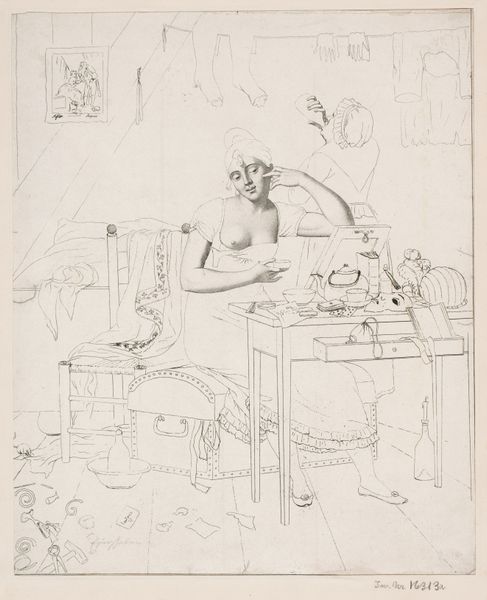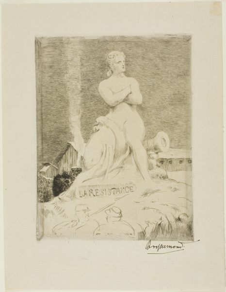 Curator: We’re looking at "Women with a Puppet," an etching created sometime between 1900 and 1905 by an anonymous artist. It’s currently held at the Minneapolis Institute of Art. Editor: My first thought is how incredibly delicate the line work is. It gives the whole image this almost ethereal, ghostly quality, like a memory fading at the edges. Curator: The delicacy certainly belies the potential social critique embedded here. The female figure, rendered nude from the waist up, is raising what appears to be a puppet above a decorated surface with a bas-relief of dancing figures, itself supported by an image and inscription that are reminiscent of stage set. The puppet could symbolize a myriad of social and political themes: manipulated power structures, female subjugation, performance and authenticity in a male-dominated space. Editor: It's interesting to see the anonymous artist grapple with these power dynamics through the medium of etching, which itself has a history of both fine art and mass reproduction. What role do you see this work playing within the wider history of French art during that period? Curator: The print's exploration of gender and performance invites consideration alongside feminist discourse, questioning not only the woman's agency, but also the art world’s role in constructing female archetypes, potentially in alignment with contemporaneous debates around female representation. There is that troubling, yet interesting choice to include an incomplete bust resembling those created of powerful political figures such as Roman emperors. I see here potential allegories regarding woman and political agency, art, stage and public spectacle. Editor: So you're suggesting the artist is subtly undermining traditional patriarchal imagery. Curator: Perhaps. It could also be interpreted as a statement about the theater, and the blurred lines between performer and puppet in the social theater, as we now call it, where women negotiate prescribed roles. There's definitely a layered commentary happening here. Editor: What do you make of the sphinx supporting the ledge the puppet seems staged on? It certainly enhances the dreamlike quality, as if everything that we see is staged. Curator: The sphinx and stage bust could represent obscured figures from French colonialism during that time, but due to the limits of detail given with etching it's more evocative, it's possible we could project any narrative of historical injustice onto those vague backgrounds that exist within this etching. The effect ultimately leaves more open to interpretation, particularly with respect to race, empire, gender, and power during the late 19th century. Editor: It seems like this work offers us a tantalizing, albeit shadowy, invitation into some of the hidden complexities underpinning Parisian social and political life at the turn of the century. Curator: Indeed. And its power lies in the understated way it challenges our assumptions.