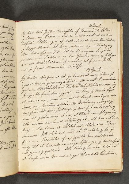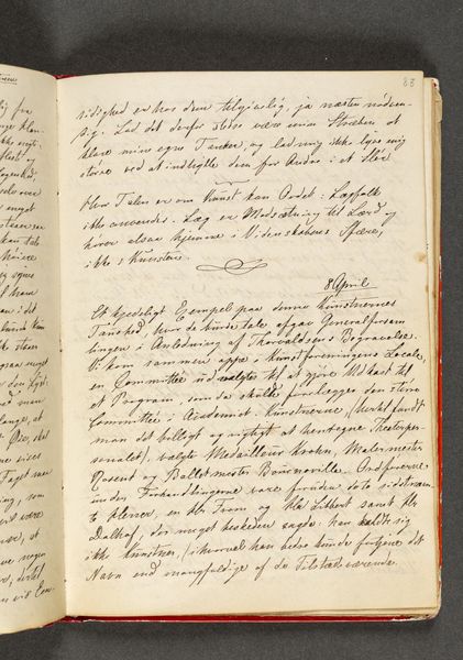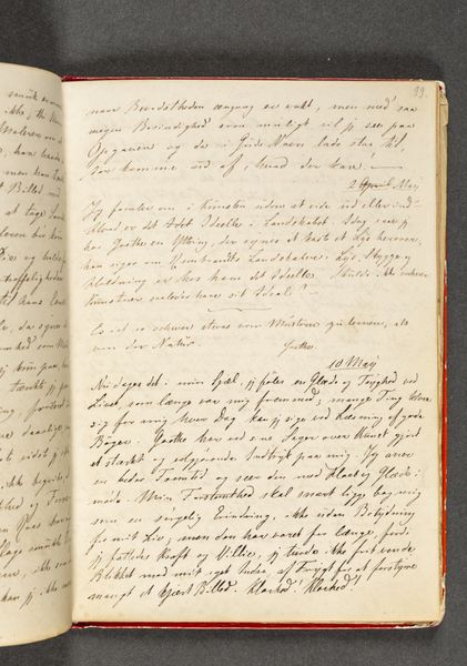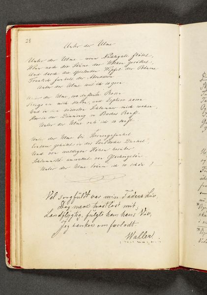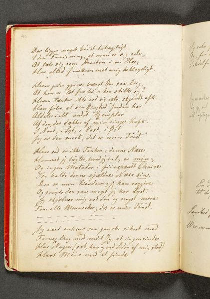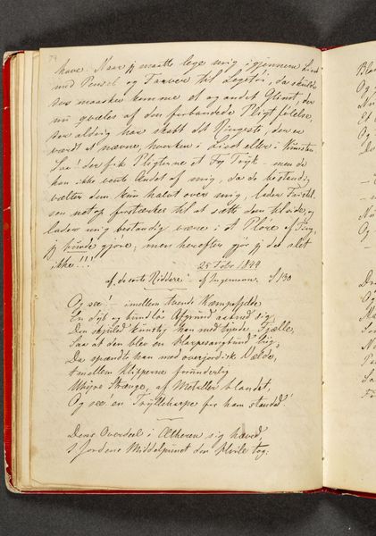 This is "Vers. Side 38" from an undated sketchbook by Johan Thomas Lundbye, a Danish artist who lived from 1818 to 1848. Lundbye, living during the Danish Golden Age, found himself amidst burgeoning national romanticism and liberalism. The open notebook page features handwritten script, poetic verses in Danish, and a quote by William Wordsworth. It's tempting to imagine Lundbye seated by a sunlit window, penning his thoughts, interweaving his cultural and artistic perspectives, or perhaps the verses are transcriptions. His personal experiences and beliefs are reflected through the writing. Themes of nature, longing, and melancholy which are often explored in his art, resonate here. The verses hint at the emotional and intellectual landscape of the time, and the artist. The notebook page becomes a mirror of the soul, reflecting his innermost thoughts, a space where personal feelings and broader cultural currents converge.