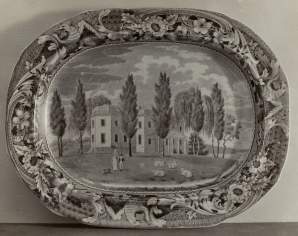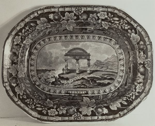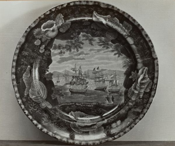 Editor: This is a plate from around 1936, titled "Niagara from American Side". It appears to be an etching or print of some kind. The falls themselves seem almost otherworldly with a monochromatic treatment, contrasted by rather busy decoration of the plate itself. What strikes you when you see this piece? Curator: It speaks volumes, doesn't it? The depiction of Niagara, a symbol of nature's raw power, contained within the domestic sphere of a decorative plate. Consider the emotional weight of this contrast. Does the image memorialize a past visit? A shared cultural experience? It also has classical and baroque imagery -- suggesting an appropriation of power or perhaps a commentary on tourism. How do these elements speak to the relationship between nature, culture, and personal identity, do you think? Editor: I suppose it tries to capture that sense of awe, making it accessible and somewhat palatable. So it’s as if Niagara becomes a consumable symbol, like a souvenir? Curator: Precisely. It’s about transforming an overwhelming force into something graspable. Note also how the bordering decorations use repeated visual elements like shells or horns. Those shapes act like framing devices around the central image itself – another layer of interpretation affecting our emotional experience of the falls. How do those baroque-inspired elements and that composition enhance or perhaps diminish its original wild essence in your view? Editor: I hadn't thought about how those details reinforce the domestication of a natural wonder, containing a feeling, even as they try to represent this force of nature. Thanks, I'll certainly view decorative art a bit differently now! Curator: Likewise, this gives us new perspective. Considering those contextual layers encourages a deeper exploration of both culture and design history.