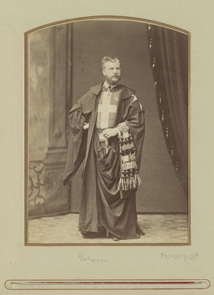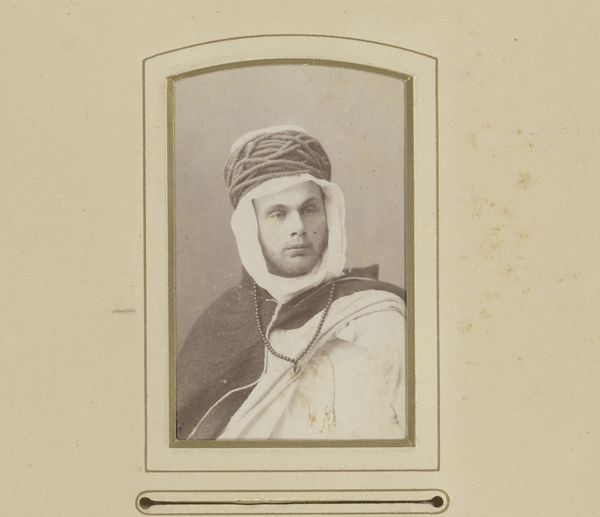 Editor: Here we have "Portret van Willem van Haersolte in 'oriëntaals' kostuum", from 1893, by J. André Garrigues. It looks like a sepia-toned photograph. There's something very theatrical about it, almost like a still from an old play. What strikes you when you look at this portrait? Curator: Ah, yes, theatrical indeed! It whisks me away to a world of Orientalism, that Western fascination with the "exotic" East. Notice how van Haersolte isn't just wearing clothes; he's performing a role. I wonder, does the photograph exoticize or does it empower him? It's interesting to think about how ideas are captured by photography versus, say, painting. The photograph flattens everything into apparent, objective truth, doesn’t it? Editor: That's a really interesting point! I hadn’t thought about it in terms of empowerment or objectification... I was too focused on the aesthetic. So, photography is like a hall of mirrors reflecting our colonial gaze? Curator: Exactly! Think about what van Haersolte knew, or what Garrigues might have known, about "the Orient" – how filtered, imagined, or skewed was their information? That costume itself…where did it come from, and what stories does it tell? Did van Haersolte, on some level, believe it really brought him closer to the culture that inspires his fantasy, or was it a lark? Editor: This makes me think about how we "consume" cultures so casually sometimes. What do we learn, and what do we lose? Curator: It is a tricky balancing act, learning *with* respect *about* reverence *for.* I always wonder what remains unseen beyond the lens of the camera...perhaps secrets kept even from the subject. Editor: Food for thought. I'll never look at a vintage portrait the same way again. Curator: And perhaps, the best art prompts a thousand questions where previously, you only had an observation.