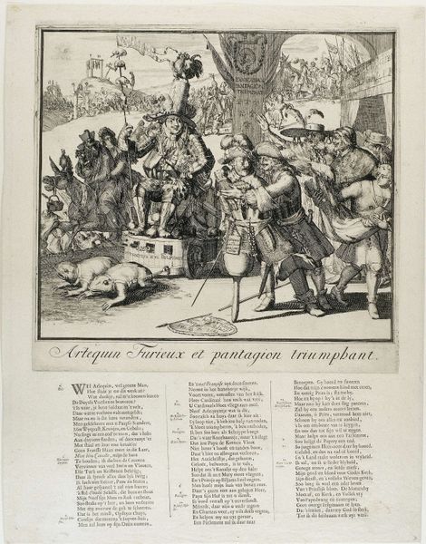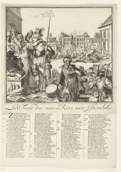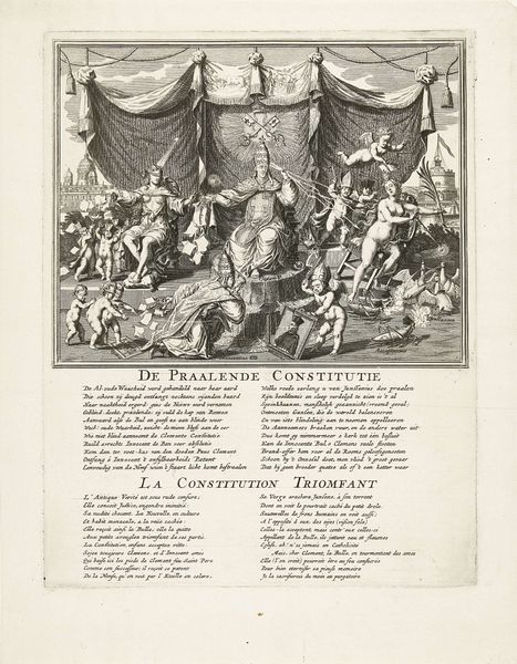 Curator: Have you seen this rather crowded print, Editor? It's "Allegory on the Peace of Rijswijk, 1697," created somewhere between 1673 and 1697. Editor: My first impression? Overwhelming! It feels like a visual feast, a chaotic but lively Baroque explosion. What’s your read? Curator: It’s an engraving, and dense is definitely the word! Coenraet Decker really packed it. The whole thing is a historical allegory, meant to celebrate the Peace of Rijswijk that temporarily paused the Nine Years' War. The original’s held at the Rijksmuseum. Editor: Ah, an allegory—so everything is symbolic. I'm noticing how the figures at the top, floating amidst clouds, look almost celebratory. But then you have what appears to be chaotic seascapes depicted toward the center with all kinds of figures. It’s such a contrast! Curator: Exactly. It’s glorifying the Peace—the central figures on the ship represent the major powers involved, sailing towards prosperity, supposedly guided by wisdom and justice. The chaos in the seas and the scenes depicted in the smaller images symbolize the hardships they are sailing away from. Editor: Look at how the artist employs a relatively dense cluster of hatched marks to create depth and convey an interesting interplay between darkness and light across the artwork's many details! Curator: It's an impressive technical display for the period. Decker uses these visual cues to direct your gaze despite the overall complexity. It's worth pausing to see all of the different textural rendering that give this baroque piece some life. Editor: A grand statement on peace and power. After this discussion, the piece reads less chaotic and more intentionally layered, revealing new narrative levels the longer you look. Curator: I appreciate its narrative, this tangible reminder of the tangible efforts that world powers take towards ceasing protracted wars.