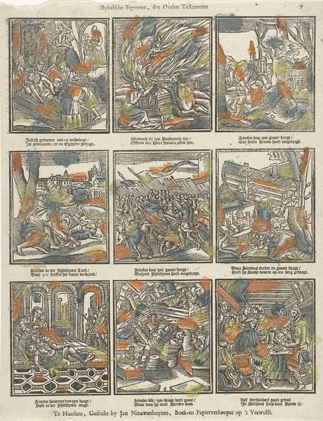 Editor: This engraving, "De historie van Adam" made by Jacobus Thompson between 1791 and 1812, presents a series of scenes that look like a comic strip, depicting episodes from the Bible. It strikes me as both quaint and a bit unsettling. What kind of dialogue do you think this artwork creates with our modern understanding of history and faith? Curator: I see it as a fascinating visual record of how biblical narratives were disseminated and interpreted in the late 18th and early 19th centuries. The artist's choices—in composition, in the selection of scenes, in the inclusion of text—reveal specific cultural and religious assumptions. Editor: Could you elaborate on the cultural assumptions that it might be revealing? Curator: Consider, for instance, the visual hierarchy and the way figures are depicted, and also think about who was accessing these prints, what were they learning, and what did they already know? These aspects speak to power dynamics related to faith, literacy, and access to religious teachings. How might its reception then compare to our contemporary visual culture and the role of images in shaping narratives of identity and belief today? Editor: It’s a huge difference, since mass production changed the speed and reach. This reminds me how artwork is still shaped by cultural context. I understand now the need to interpret it through a historical lens. Curator: Precisely. By examining such works critically, we can learn so much about how societies construct and transmit their values. It offers a lens to examining present beliefs.
