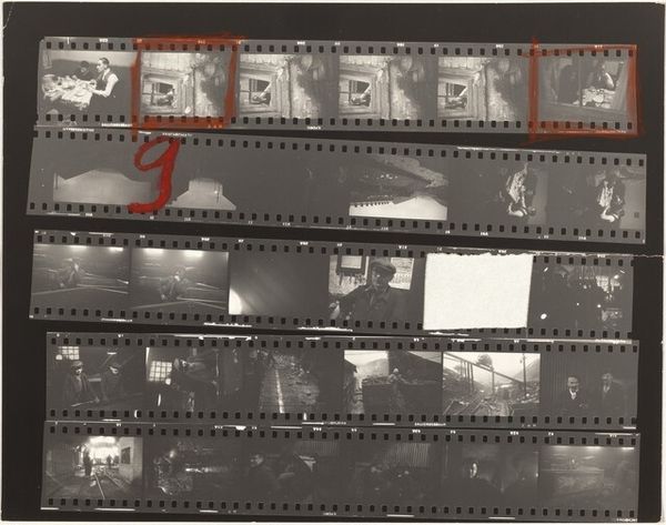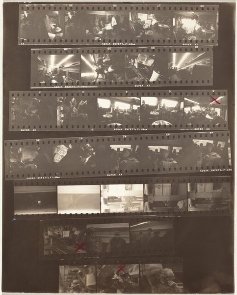 Editor: This is "Congressional B" by Robert Frank, a gelatin-silver print from around 1954 or 55. What strikes me is how it’s presented: multiple strips of negatives, some marked with an "X." What do you see in this work? Curator: The “X” is quite telling, isn't it? Frank is making a conscious choice about what *not* to show, editing, curating his own experience for us. Consider what the train itself represents in American mythology—a journey, transition, but also constraint, tracks laid out for you. Editor: So, the journey is predetermined? Curator: Not entirely. Look at the faces, obscured, fleeting. What does that tell us about individual experience versus collective identity within a structure like government, suggested by "Congressional"? Frank offers glimpses, but complete understanding remains out of reach, much like the political process itself. What feelings arise from these incomplete narratives? Editor: A sense of alienation, maybe? The "X" marks create a feeling of rejection, like the images weren’t good enough. Curator: Perhaps. Or perhaps they are too revealing? Consider the context: mid-1950s America, conformism was dominant. Frank, an outsider, might be suggesting that even within the heart of government, there’s a hidden story, a dissonance that can’t quite be captured or controlled. The strips also evoke cinema, and government and spectacle have an inextricable bond, one always being staged and processed by the other. Editor: That’s a great point, about the staging. Seeing the process—the film strips—is like seeing behind the scenes. I'll remember that. Curator: Exactly. The layers of meaning and experience, like the layers of film, create a profound impact. This makes us consider what is absent as much as what is present, and who controls those narratives.
