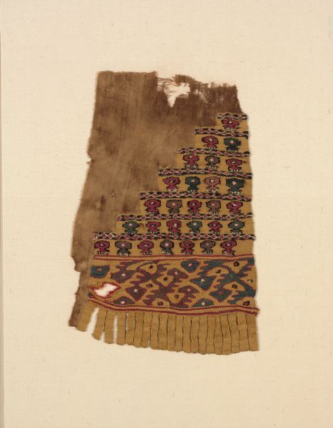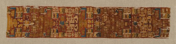 Curator: Looking at this woven fragment, there's a somber, almost ethereal quality to its surviving elements. Editor: Yes, it does carry a particular presence. We know this textile comes from the Lambayeque culture, a Pre-Columbian civilization along the northern coast of modern-day Peru, with this piece likely created sometime between 1000 and 1476. The Art Institute of Chicago aptly calls it "Fragment," leaving its complete story tantalizingly incomplete. Curator: Right. As a fragment, its vulnerability and strength intertwine. Notice how the warp and weft visually depict what seems to be a ceremonial figure standing above smaller individuals, or perhaps offering something. Are those bird-like figures in tow? It’s striking how art visualizes social roles, power dynamics and the relation between humankind and nature. The condition of it speaks of the vulnerability of indigenous knowledge and traditions, and also of their defiance. Editor: I agree. Textiles such as this played crucial roles in Lambayeque society. The ruling elites probably commissioned specialized artisans who worked primarily with cotton and alpaca wool, weaving elaborate scenes like this one to reinforce social hierarchies, legitimize authority and broadcast Lambayeque cosmology. Curator: Indeed, each symbol would have possessed significance, resonating with deep-seated cultural meanings now largely lost to time. Considering what it may have represented, its survival seems remarkable. The degradation could even underscore a shift in power as these indigenous practices fade. How interesting is that an old piece like this still talks to contemporary gender studies and theories of race? Editor: The visual rhetoric and the symbolic charge embedded in these works undoubtedly provided a sense of order and continuity within a society undergoing significant socio-political changes and facing existential threats. By understanding that function, we begin to appreciate its role in identity formation as well. Curator: I hadn't quite framed it that way. This little snippet speaks of a culture's profound creativity and resilient self-representation even while facing a kind of disintegration through colonial power. Editor: And the fact that we can examine it now, centuries later, sparks conversations across disciplines. That continuing conversation helps broaden our own perspectives.
