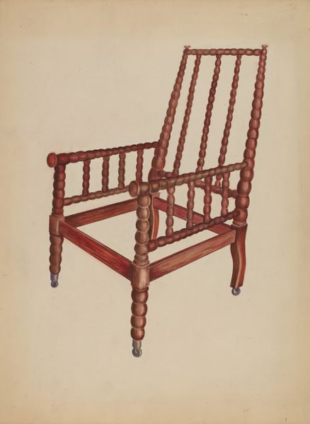 Editor: So, this is Henry Murphy’s "Banister Back Chair," drawn between 1935 and 1942. It's a simple pencil drawing on paper, almost photorealistic in its depiction of this rather humble chair. What initially strikes me is how such a mundane object is given this formal treatment. What do you see in it? Curator: It’s fascinating how the seemingly mundane can reveal larger societal currents. Considering the period, the late 1930s and early 40s, this meticulous rendering of a common object takes on new significance. What public institutions do you think might have supported an artist creating this kind of detailed study of an everyday chair? Editor: Well, during that era, the WPA comes to mind. Were artists tasked with documenting aspects of American life, even something as simple as a chair? Curator: Precisely! Think about it: The WPA aimed to provide economic relief, yes, but also to create a cultural record. These detailed renderings helped create a national archive, almost a visual inventory, documenting material culture during a tumultuous period. It elevates this simple chair, doesn't it, giving it a historical weight it might not otherwise possess? Editor: It definitely does. So, it's not just a chair; it represents a conscious effort to preserve and perhaps idealize a certain vision of American life during the Depression era? Curator: Exactly. Consider how the 'academic art' style, combined with the subject, speaks to a yearning for stability, tradition, and even perhaps a simpler past during times of immense social change and uncertainty. Even the choice of a "banister back" design connects us to a longer history of vernacular design. Editor: That’s given me a new perspective. I was initially focused on its aesthetic qualities, but you’ve revealed a whole layer of historical and political context I hadn’t considered. Curator: That’s the power of art history! It teaches us to look beyond the surface and understand how socio-political forces shape both the production and reception of even the most ordinary objects.