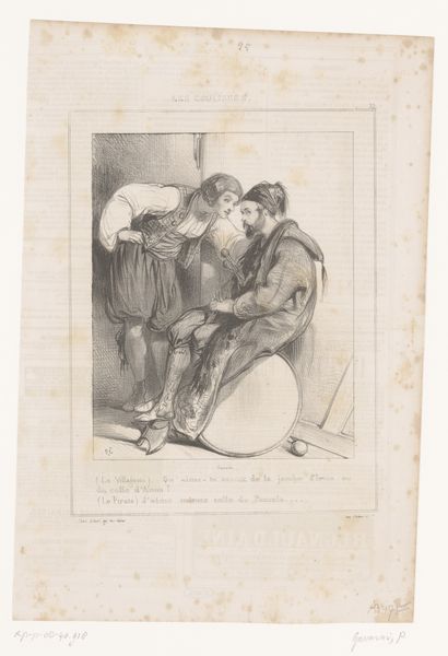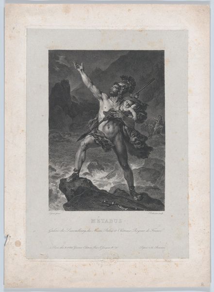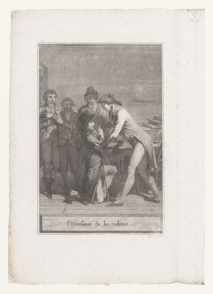 Curator: Let’s discuss “Spaanse oorlogsheld Miguel Salamero verdedigt Zaragoza,” or “Spanish War Hero Miguel Salamero Defending Zaragoza,” a print made by Juan Galvez sometime between 1808 and 1814. It presents a stark scene within what looks like an interior. What are your initial impressions? Editor: Immediately, the contrast of light and shadow catches my attention. It’s almost theatrical. There’s an intensity to the moment. The central figure is ready to defend his position, rifle aimed and steady. Curator: I notice the way the artist organizes the composition. The brick arch creates a strong horizontal line, grounding the scene. Note how the figure and the rifle held parallel divide the space between light and darkness in a structural opposition. It directs your eye. Editor: Yes, there’s a powerful simplicity in the framing that echoes archetypal symbolism. Miguel Salamero stands in this dark tunnel or passageway, which makes me think about the trials of a hero. His very posture—defiant against what the dark walls imply—it suggests courage. The light focuses so firmly on the group and draws our attention, but it simultaneously isolates them as though there are unseen forces at work in the darkness that push back. Curator: The choice of medium here is telling. Engraving allows for precise lines and contrasts, suitable for portraying a narrative focused on one central figure during times of conflict. It evokes realism with details but is economical in how it depicts space and narrative. Editor: And yet it’s more than realism—this image could not simply be ‘realistic’—this piece elevates him to near-mythical status. This image and its dissemination undoubtedly bolstered public morale and resolve in a time of profound distress during the sieges. He becomes an ideal of heroism. Curator: Agreed. Examining the artwork has underscored the potent way that symbolism and historical accuracy can come together. Galvez creates a powerful impression. Editor: A vital reminder of the capacity for even relatively simple images to resonate powerfully across generations. It shows you something you may not know—history from a new, intimate point of view.