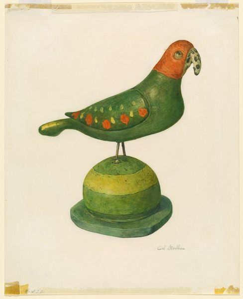 Curator: This is Elmer R. Kottcamp’s “Chalkware Bird,” believed to date from around 1940. What’s your initial take on it? Editor: Well, immediately, I notice its fragility. The pale watercolors, that small bird perched so deliberately… it evokes a sense of fleeting beauty, like a memory about to fade. Curator: Interesting. I'm drawn to the materials implied in the title. "Chalkware" refers to plaster figures often painted to mimic more expensive ceramics. Given that Kottcamp chose watercolor, perhaps there’s a commentary on imitation or accessible art for the masses. It is figuration combined with drawing and painting, as shown by our records. Editor: Perhaps. Birds often serve as symbols of freedom, the soul, or even messengers from the spiritual realm. Paired with the pedestal, it almost becomes a sacred object, raising the mundane to something divine. Do you also notice the color use? It seems naive, which can carry an even deeper meaning when looking at symbolism. Curator: It's naive in style indeed. But I wonder, is it truly naive or is Kottcamp carefully emulating a popular aesthetic? This was after all, during the pre-war era in America. Consumer culture was flourishing alongside folk-art revivals. Maybe it reflects a longing for simpler, handmade items in an increasingly industrialized world. Editor: That’s a thought-provoking idea. This brings a very powerful message through its apparent simple design. That bird is resting its meaning on the shoulder of past cultural knowledge. Curator: And the method Kottkamp is using, combining colored pencil and watercolour for instance, how does that fit the era, the economic status of the author, and so forth. Editor: True. Thinking about how this little bird echoes through artistic memory—a humble chalkware figure, depicted with delicate skill, layered with cultural baggage. Curator: Precisely, and I guess both angles enrich the object further for an engaging audience journey. Editor: Exactly! It leaves me pondering the simple beauty that speaks volumes.