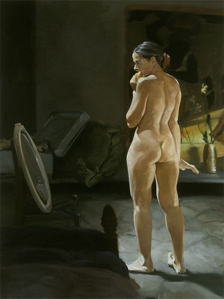 Eric Fischl painted this scene, titled *The Travel of Romance, Scene IV*, with oil on canvas. It's a mysterious image that speaks to the complexities of intimacy and the performative nature of relationships. Made in the United States, most likely in the late 20th or early 21st century, the scene presents a nude woman in what appears to be a domestic setting. Her posture and the discarded clothing imply vulnerability, but also perhaps a sense of agency. Fischl’s work often delves into the hidden tensions within suburban life, reflecting a broader cultural preoccupation with identity, sexuality, and social norms. The theatrical title suggests this is one part of a broader narrative. Is it a commentary on the commodification of love, or the artificiality of social roles? Understanding this artwork requires looking into Fischl's biography, the cultural anxieties of the time, and the rise of postmodern art that questioned traditional values and artistic conventions. Only then can we appreciate its unsettling power.