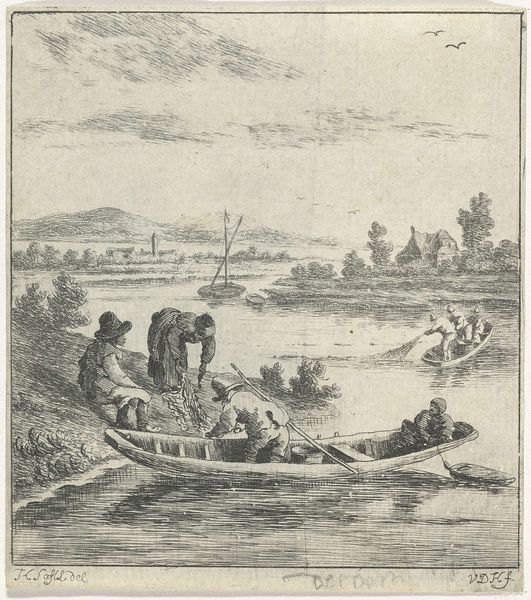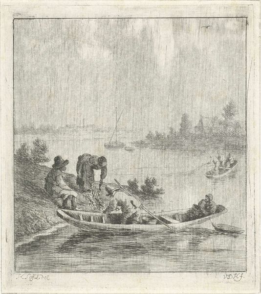 This image, etched by Jan Izaak van Mansvelt, depicts figures in a rowboat on a river. Here, the river is not merely a body of water, but a symbol—a conduit of life and movement, reflecting both the sky above and the depths below. The boat, carrying its passengers, becomes an archetype—a vessel of passage, not unlike the ships found in ancient Egyptian funerary art, transporting souls across the waters of the afterlife. The act of rowing, propelling the boat forward, recalls the cyclical nature of existence. Consider how, in mythology, rivers often mark boundaries, thresholds between worlds. This scene evokes a sense of journey, perhaps hinting at life's transient nature, a theme that resurfaces throughout art history. This journey is not linear but a return, embodying the eternal dance of existence.