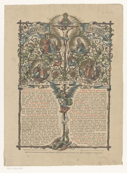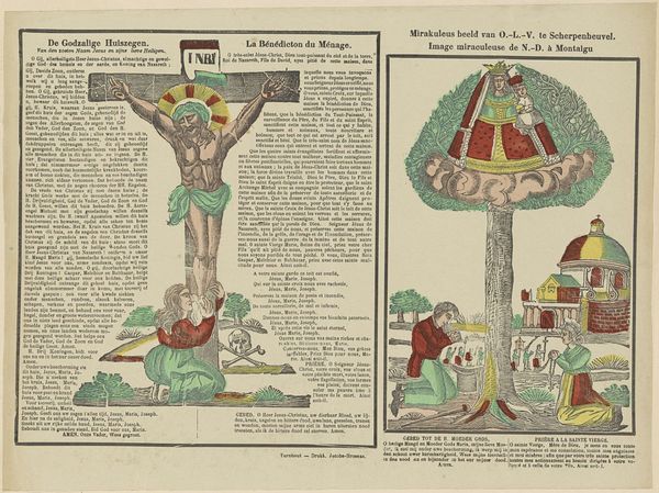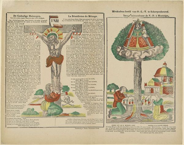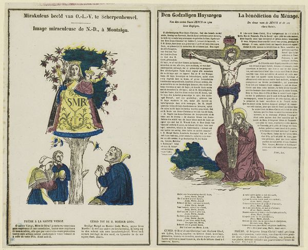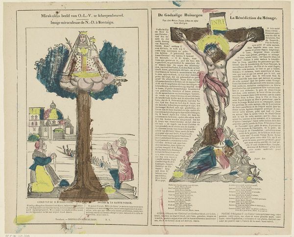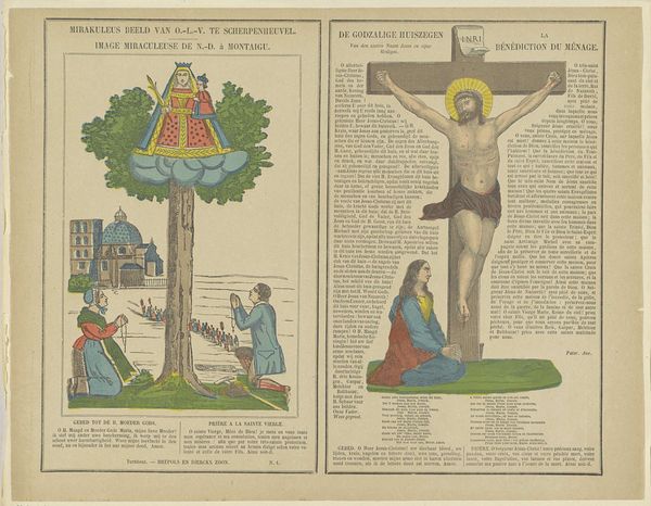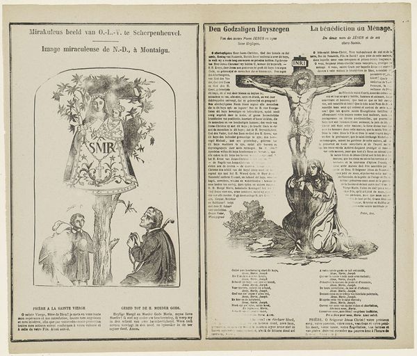Editor: This engraving, dating from 1800 to 1833 and titled "Het mirakuleus beeld" by Philippus Jacobus Brepols, features a fascinating dual composition, almost like a diptych on paper. I'm particularly struck by the contrasting imagery – a serene, almost folk-art depiction on the left, and the more dramatic crucifixion scene on the right. What visual relationships do you see between these two panels? Curator: The visual relationship is structured primarily through the bilateral symmetry across the printed page and how that page presents these stark representational modes, with the material support emphasizing a thematic contrast. Note the use of linear perspective in both, yet to distinct ends. The left employs a simplified plane to represent the "mirakuleus beeld," flattened to amplify devotional significance, whilst the right displays a dramatic Baroque composition. The formal interplay foregrounds not a unified narrative, but rather opposing stylistic and theological viewpoints of this folk tradition. How does the flatness versus depth influence your understanding? Editor: I hadn’t considered it that way! The flatness almost invites interaction with the devotional aspects on the left, like it’s a tangible, approachable miracle. Whereas the depth on the right seems designed to create distance and awe toward religious figure, a spectacle. Curator: Precisely! This contrast invites us to investigate the composition—and material composition as a printed engraving—in communicating distinct emotional registers and purposes for a religious artwork. The use of the engraving supports dissemination in domestic devotional sphere versus high church tradition. Editor: I see. So by looking at the techniques and form, we can grasp the varied purposes. Curator: It reframes our understanding, seeing beyond just historical depiction to appreciating formal intentionality. This challenges a viewer’s expectations about religious presentation through printing practice and a distribution of aesthetic priorities. Editor: That's given me a fresh appreciation of this piece – thinking about it formally has unlocked layers of meaning I hadn't even considered!