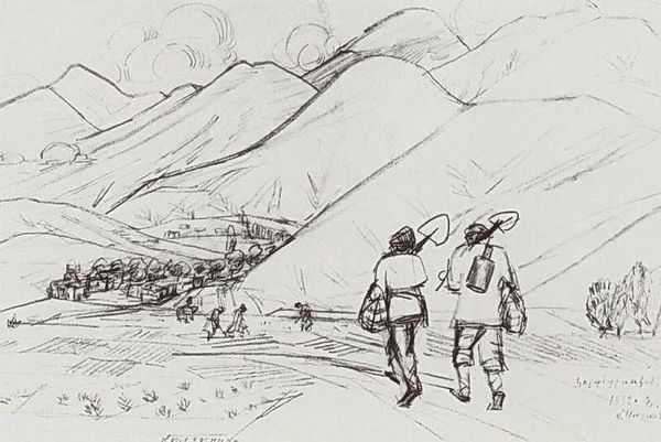 Editor: Here we have Boris Kustodiev’s "From Fishing," created in 1923, using ink and graphite on paper. The stark contrast between light and dark really grabs you, and there's almost a sense of harshness in the scene. What strikes you most about its composition? Curator: Indeed, the dramatic chiaroscuro establishes a compelling visual hierarchy. Observe how Kustodiev utilizes varied line weights to delineate form and spatial recession. The textured application of ink suggests a palpable atmospheric effect, drawing our eyes across the flat picture plane into the imagined three-dimensional space. How do you interpret the angularity in contrast with soft textural rendering? Editor: The sharp angles, especially in the figures and foreground, seem to convey tension, whereas the softer lines in the sky create a sense of depth, almost peace. The contrast feels deliberate. Could the linear details serve as a visual symbol of stress and texture? Curator: An astute observation. Consider, however, the relationship between these linear details and the overarching structure. Do they enhance or disrupt the overall visual unity? Is it about tension, or might the linearity denote action, dynamism? The strategic deployment of ink washes serves not merely to replicate nature, but to generate a dynamic interplay between form and void. Editor: I see your point. It's more about the push and pull between activity and rest within the visual field itself, a construction of form. Looking at this piece has made me think differently about the relationship between line and depth, and how an artist can use seemingly simple techniques to create complex, visual stories. Curator: Precisely. Such works provide unique insight into how fundamental elements operate, quite separate from subject or historical grounding.