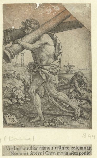 Curator: This dynamic engraving, created by Heinrich Aldegrever around 1550, depicts Hercules slaying the dragon Ladon. It's part of a series illustrating the Labors of Hercules, currently housed at the Metropolitan Museum of Art. What strikes you most about it? Editor: The sheer ferocity! The dense crosshatching heightens the tension of the combat. Ladon's contorted body and Hercules' determined stance really give a sense of brutal struggle. There's something archetypal here, wouldn't you say? Curator: Absolutely. The image of a powerful figure dominating a monstrous entity taps into so many cultural narratives of dominance. We could deconstruct this power dynamic to ask what symbolic function does the vanquishing of the "monster" play? Who does this narrative benefit and who does it marginalize? Editor: Fascinating point. Dragons, or serpent-like forms, are near universal symbols for chaos and the unknown, the feminine even. So, Hercules here could be seen as embodying the civilizing force, suppressing wild, untamed nature. Curator: Exactly. And consider Aldegrever’s social context. This piece emerged during a time of religious and political upheaval. Representing Hercules, a symbol of masculine strength and order, conquering a serpentine “other” might be viewed through the lens of solidifying patriarchal norms. The composition's focus on male strength contrasts the dragon as a monstrous distortion of natural order. Editor: The imagery does lend itself to that. The positioning of the tower also captures my attention. In my experience towers often signify aspiration but also vulnerability, even imprisonment. Here, it's as if Hercules protects or defends the established order. Curator: It brings up important questions about what the established order truly represents, and what is being sacrificed to maintain it. Looking at it now, I can’t help but view Hercules, not as the hero, but as an imposing, and potentially destructive force, which leads me to also question if the image speaks to an ambivalent and critical gaze toward power? Editor: It does give us a great deal to think about! Thank you for offering a contemporary understanding of such symbolic artwork. Curator: My pleasure. And thank you for offering your insight into the symbols and archetypes at play within Aldegrever’s striking print.