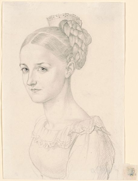 Curator: Welcome. Today we'll examine a drawing of Celeste Richomme, crafted by Louis-Antoine-Léon Riesener. Its date is, regrettably, unknown. Editor: The first thing I notice is how delicate and ethereal the drawing feels, almost as if I’m seeing a memory fading on the paper. There’s such a gentleness in her gaze. Curator: Indeed. Riesener’s expert manipulation of graphite on paper generates precisely that effect. Observe the restrained yet confident lines. The artist prioritized achieving likeness through strategically placed shading. Editor: And look at how the lines seem to dissipate as they flow down from her face and shoulders to the barely-there bodice—it is all implication. I imagine the dress as plain, perhaps even somber, reflecting an introverted character? Curator: Possibly. But the rendering avoids sentimentality by remaining steadfastly analytical in its representation. The focus pivots from decorative embellishment to structural purity, where tonal variations map out her form. Note too, how the dark graphite washes behind her serve as compositional anchors. Editor: I love that the darks serve a purpose of both shadow and design. Celeste's expression hints at introspection. I keep wondering what was on her mind when this likeness was captured. Curator: Considering Riesener’s formal academic background, speculation must be framed through an awareness of 19th-century portrait conventions. However, such close examination invites personal reflection beyond simple cataloging of form. Editor: True. Despite a portrait tradition demanding some degree of idealism, Celeste's portrayal still lets a palpable sense of individuality shine through. I bet she didn't know she would be sitting here, hundreds of years in the future, inspiring us! Curator: It prompts broader consideration on modes of seeing and making, revealing connections across temporality and subjecthood. The drawing transcends itself through visual, material language. Editor: Well, for me, it’s that lingering emotional charge that counts! A fleeting encounter caught in time that is deeply affecting, isn't it?