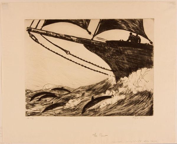 Curator: Sears Gallagher's "Heavy Surf at Monhegan" presents us with a dynamic coastal scene. Editor: It's a flurry of dark and light. The artist captures the ocean's raw energy and the stark, unyielding rocks. I find it moody. Curator: Monhegan Island was a popular artist colony; the image reflects a broader interest in depicting the sublime power of nature during that period. Gallagher actively exhibited his work in numerous venues and societies, contributing to and benefiting from a growing interest in American landscape imagery. Editor: Notice how the composition leads the eye—from the turbulent water in the foreground, up and over those dark, angular rocks, to the horizon where the waves break. Curator: And Gallagher's etching technique really emphasizes the contrast between the solid rock and the fluid, ever-changing water. Editor: Yes, it's a potent study in textures—the rough, jagged rocks against the smooth, swirling water. Curator: Exactly. This work provides insight into the cultural fascination with the sea as both a source of beauty and untamed power. Editor: An impressive dance of dark and light, action and stillness.