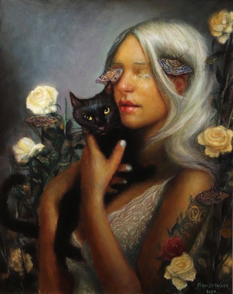 Rose Freymuth-Frazier’s painting presents a young woman holding two cats, adorned with flowers, butterflies, and aviator goggles. The oil paint, expertly applied, lends the piece a classical feeling. The smooth, almost polished surface allows light to subtly define the contours of her face and the soft fur of the animals, which speaks to the artist's technical skill and understanding of the medium’s potential. The attention to detail, especially in the rendering of textures, invites us to consider the labor involved in creating such a lifelike depiction. With its echoes of both Renaissance portraiture and surrealism, the image reminds us of the intertwined histories of creative practices, craft, and fine art. By embracing traditional techniques, the artist imbues the painting with a sense of timelessness. Ultimately, "Survivors" demonstrates the enduring power of materials and skilled making in conveying complex narratives and emotions.