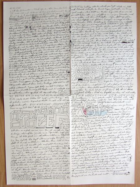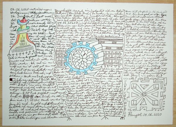 Editor: This piece, "Nr 9" by Armin Andreas Pangerl, was created in 2020, using mixed media, ink and drawings on paper. The overwhelming detail almost overwhelms. I’m struck by how busy it is. What’s your take, Professor? Curator: Indeed, the density is compelling. It is fascinating how Pangerl layers textual and visual elements, blurring the lines between documentation and artistic expression. Notice how the linework seems to build geometric and organic forms simultaneously, then what seems like pure text or diagrams elsewhere. Editor: I see that! Can you elaborate on the function of this seeming cacophony of form? Curator: Formally speaking, it appears that the artist uses the contrast between structured and chaotic mark-making to create visual interest. What do you observe in the relationship between text and image? Editor: It seems the artist isn't really trying to clarify through language and drawing but obscure with symbols. The whole thing starts to look like one huge, single field. Curator: Precisely. The distinction dissolves, causing us to reconsider where and how meaning emerges from a piece. Is meaning something found in it or produced by our perceptions? Is it structured or arbitrary? The forms could equally emerge by themselves! What can we take from this exploration? Editor: I didn’t think about questioning whether I needed to decode meaning. Looking at this piece has made me think about whether there really *is* anything to understand. Curator: A fitting end! Works like "Nr 9" test our presumptions about art, meaning, and ultimately, our role as viewers.