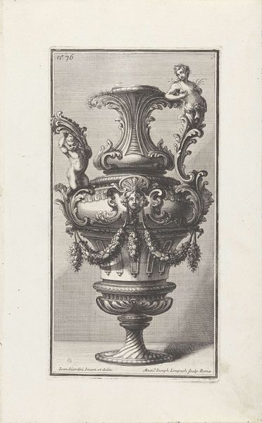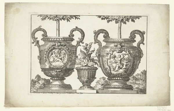 Curator: Before us, we have an engraving from before 1800, attributed to an anonymous artist. The work, held here at the Rijksmuseum, is titled "Twee grote urnen en een kleine urn"—"Two large urns and a small urn." What's your initial read on this piece? Editor: There's a solemn formality, don’t you think? The baroque detail, combined with the monochrome print, speaks of memory, of traditions meticulously observed. Like a stage set for rituals we no longer quite grasp. Curator: The style is definitively baroque, as you point out, which locates it within a very particular socio-political framework. Aristocratic display was, of course, inseparable from the exercise of power at this time. Engravings like this one circulated as models for actual objects, asserting a cultural capital associated with refinement and taste. Editor: Absolutely. The urns themselves – containers for ashes – are so potent as symbols of death and remembrance. Look at the sculpted figures on each; stories frozen in time, but eternally resonant with the cycle of life and mortality. That smaller urn almost feels like a child, a family group memorialized. Curator: I agree; the cultural currency of such displays cannot be overlooked. Commemorative objects reinforced social hierarchies. But what stories do you imagine are represented on them? Do they reference classical allegories that served as a bedrock of values? Editor: Likely, though I'm drawn more to the suggestion of human drama than specifics. The forms almost dissolve into abstraction, the narrative secondary to the impact of a contained human presence. It almost becomes the spirit animating an otherwise inanimate object. Curator: That's a pertinent consideration. Though rendered through what we recognize now as an "old engraving style," there's nonetheless the deliberate intention to link present-day sensibilities to classical or idealized pasts. In short, these were not simply decorative items, but tangible claims on historical and moral authority. Editor: I'll concede you the authority angle. The very symmetry, the idealized figures…these prints sold aspirations as much as urns. For me, the symbolic weight lingers after you stop counting how many dukes had one of these in their gardens. Curator: Agreed. And hopefully we've managed to tease out a few of those complex layers that speak to both artistic intent and its place within the culture of its time. Editor: Indeed, giving us plenty to consider about memory, mortality, and status all bound together within these beautiful containers.