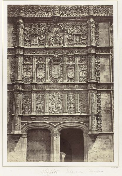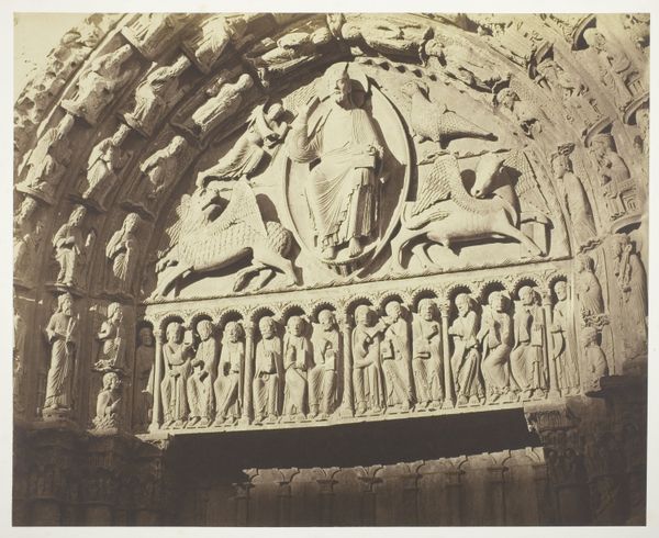 Curator: Looking at this print by Charles Nègre, taken around 1857, we see a photograph of the Chartres Cathedral, specifically the west side's right door, which dates back to the 12th century. Editor: Wow, it’s like staring into a whisper from the past. The detail! It feels impossibly grand and a little bit haunted, doesn't it? So much texture in what must be ancient stone. Curator: Nègre was working at a time when photography was still relatively new. He, alongside other photographers, documented architectural monuments. This photograph shows a doorway laden with Romanesque sculpture—figures tightly packed, telling biblical stories in stone relief. This photograph would have allowed greater appreciation of the skill involved, more usually understood through drawings at this time. Editor: Exactly! All those figures seem almost piled on top of each other, but you can also see that the photograph lets light and shadow play across everything. There's something really beautiful about the contrast of light and dark here. It reminds me of that feeling you get when you enter a big old cathedral, that hush and feeling of history folding around you. Curator: That play of light, of course, would have held symbolic weight during the time when the Cathedral was constructed; but let’s consider Nègre and his role in depicting that door in this way. Architecture served a social purpose, of course, and was also harnessed in this photograph as part of the national drive at this point in time to preserve French history and identity. Editor: So Nègre is not just pointing and shooting – he's making choices about how to portray Chartres, shaping our understanding of this imposing monument even now. This photograph speaks volumes. The light and shadow seem to be telling their own silent story – what it might feel like, as the everyman or woman, to go through those very doors. I love it when an image invites you in like that. Curator: Absolutely. The photograph offers us a fascinating lens through which to consider not only the artistry of the cathedral’s original sculptors but also Nègre’s own contribution to our understanding of cultural heritage and its representation. Editor: Indeed. And for me, it highlights photography's power not just to record, but to almost poetically reimagine history through shadow and light.