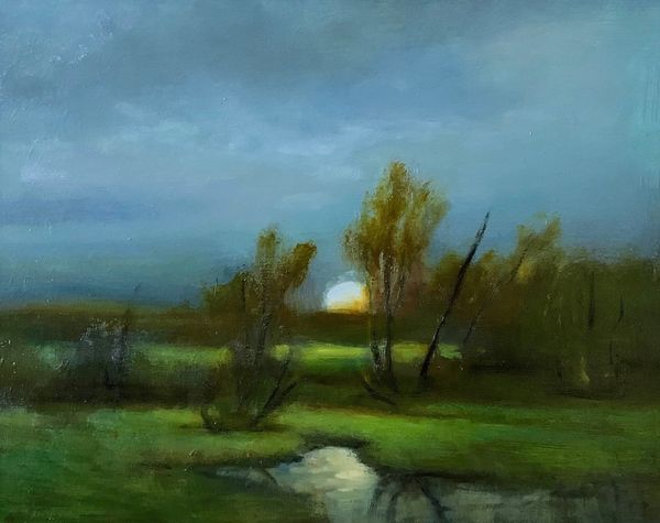 Curator: Rose Freymuth-Frazier's "Silver Lining," created in 2017 using oil paint in the plein-air style, captures a landscape under a dramatic sky. The impasto technique lends a tactile quality, doesn't it? Editor: Absolutely, the sky evokes a powerful emotional resonance for me. The churning dark clouds create this tension with the illuminated blue patch above. It’s as though hope, or a divine presence even, is breaking through. Curator: Fascinating to consider that interplay between darkness and light. When I look, I see the labor involved – the artist physically present, battling the elements perhaps, layering paint to capture a fleeting atmospheric moment. You can almost feel the wind and dampness. Editor: It's the Romanticism inherent in the subject. These turbulent skies, common in Romantic painting, reflect inner emotional turmoil or, perhaps, humanity's smallness in the face of nature's grandeur. Does the location matter, or is it universal? Curator: The universality, I think, comes from the artist's dedication to documenting a specific location through the labor of close observation. The choice of materials too – oil paint, favored for its ability to capture light and atmosphere – links the process intimately with the result. What kind of canvas and brushes, do you imagine, facilitated this effect? Editor: Right, so each brushstroke contributes to an understanding. And, the trees and reflecting pool—are those meant to symbolize purity or clarity in opposition to the turbulent sky, or does that bring too much intentionality to what might be purely intuitive? Curator: Well, by selecting and framing the view as she does, Freymuth-Frazier is intervening. Her subjective experience impacts what she paints, transforming the landscape. But the focus remains grounded in that lived, physical interaction. Editor: Still, isn't that relationship an enduring artistic challenge? Reconciling our interior worlds with what we observe outside ourselves, trying to make meaning of external chaos… it certainly offers a rich tableau here, don’t you think? Curator: I think examining its creation reveals far more about how we consume such ideas in the art. Editor: True, it's all interwoven; a captivating expression that certainly bears further contemplation.