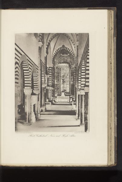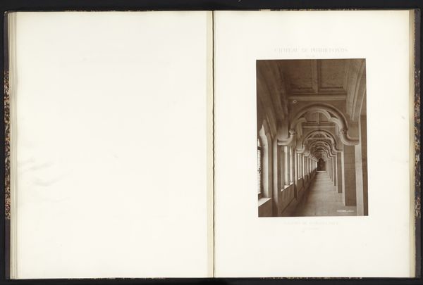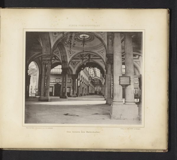 Editor: Here we have Félix Bonfils's photograph, "Kloostergang in de Paternosterkerk op de Olijfberg in Jeruzalem," dating from 1867-1885. It's a rather stark monochrome print. I'm struck by the oppressive repetition of arches and the seemingly endless corridor. What catches your eye about this piece? Curator: Ah, yes! Bonfils, a master of light and shadow, capturing not just a space but a feeling, a presence. Notice how the light diminishes into the distance, drawing your eye towards a point of…mystery. But it's the textures, too. The worn stones whisper of history, of countless footsteps and muttered prayers. This photograph isn’t just *of* the cloister, it *is* the cloister. What do you imagine echoes in that space? Silence? Prayers? Editor: I definitely feel the sense of silence... maybe a quiet murmur? The plates lining the walls seem to be reflecting a similar, murmured prayer in repetition. It does provoke a pensive mood, or am I projecting? Curator: Project all you like! Art *needs* our projections, our echoes of the self. The repetition is almost meditative, don’t you think? Like chanting… or maybe the anxious repetition of worried thoughts? And consider Bonfils himself - a European capturing a holy site in Jerusalem! What was his perspective? Was it reverence, scientific curiosity, or something in between? Editor: That is quite a question! I hadn't considered the artist's position in all of this, but it definitely reframes my thinking of it. Thank you for opening my eyes to it. Curator: My pleasure! Art history isn't about dates and titles - it's about seeing, feeling, questioning. And isn't that much more interesting?