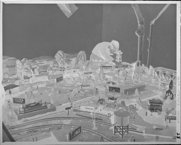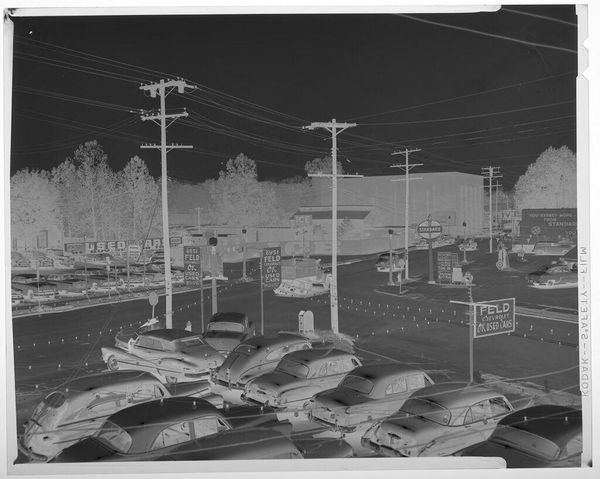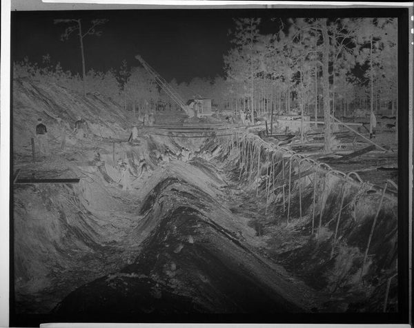 Editor: This photograph, "Untitled (large construction project; building a highway)" by Jack Gould, captures a massive construction site. The inverted tones make it look almost apocalyptic. What do you think it tells us about its time? Curator: Well, considering its focus on infrastructure, this photograph likely reflects the mid-20th century's emphasis on urban development and expansion. It's interesting to consider how such projects reshape not only the physical landscape but also social structures and access. Editor: So, you’re suggesting it might be about more than just building a road? Curator: Precisely. It prompts us to think about who benefits from such developments and whose communities might be disrupted or displaced. The image also carries an eerie, dehumanized quality, highlighting the scale of these projects in relation to individual lives. Editor: I hadn't considered the social impact of infrastructure like that before. Thanks for the insight! Curator: My pleasure. It's always revealing to view art through a historical and social lens.