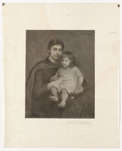 Editor: We're looking at a photo reproduction of Giulio Romano's "Madonna and Child," dating from around 1890 to 1920. It's currently housed in the Rijksmuseum. The soft focus gives it this dreamlike, almost haunting quality. How do you interpret the visual language used here? Curator: The photograph offers a fascinating exercise in the translation of media. Focus first on the composition, the deliberate arrangement of figures. Note the central positioning of the Madonna and child, counterposed by the additional figure, presumably Saint John the Baptist. Consider then the formal effect of the photographic print – how does the translation from paint change the overall aesthetic quality? Editor: It feels less vibrant, more muted than what I would expect from a Renaissance painting. Is that just the difference between a painting and photography? Curator: In part. The greyscale flattens the original dynamic interplay of color. This changes how we read the relationships between the figures. Without vibrant color, we focus on form and shadow, the way light defines the subjects and their spatial relationships. Consider, too, the way the sharp lines have softened, what effect does this diffusion have on your reading of the piece? Editor: I see now that the haziness creates a sense of depth, as if veiling the holy figures behind a cloud, or perhaps a memory. The contrast emphasizes the faces and brings forward the hands. Curator: Precisely. It brings a new dimension of temporality and re-presentation. In what way does this shift your perception? Editor: Thinking about it that way helps me appreciate how reproductions can bring their own unique perspectives. I was so caught up in the reproduction being “less than” the original. Curator: Indeed. By analyzing formal choices, we understand better the nuances of reproduction, and its artistic intervention.