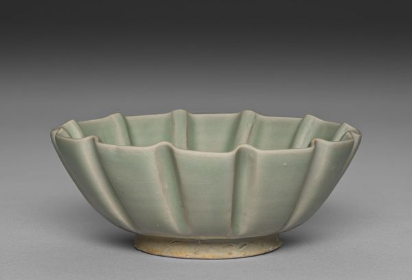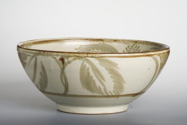 Curator: This is Richard Batterham’s simply titled "Bowl," residing here in the Tate Collection. Editor: The bowl has a quiet, almost serene quality to it. It's unassuming, yet the craftsmanship is evident. Curator: Precisely. Batterham was known for his commitment to traditional pottery methods and using locally sourced clay. He highlights the inherent qualities of the material. Editor: You can see the maker's hand in the subtle imperfections of the glaze. The repeated geometric pattern around the bowl feels almost like an industrial mimicry, yet it still holds the warmth of handmade design. It's a fascinating tension. Curator: It's tempting to interpret those subtle marks as an expression of the artist's intent, a desire to merge form and function in a harmonious whole. Editor: Perhaps, but I also think it reflects the value of labor and the beauty found in the everyday object. It bridges the gap between art and utility. Curator: Indeed, seeing it this way expands the narrative from the aesthetic to the socio-economic. Editor: Looking at it with that perspective, it’s a reminder of art’s connection to the processes of crafting, forming, and molding.