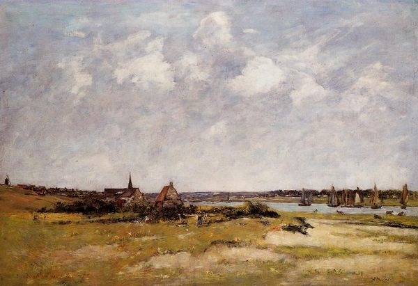 Curator: Oh, hello! Right now, we are standing in front of "Gray Day. The Swamp." painted by Isaac Levitan in 1898. It's currently housed in the Tretyakov Gallery in Moscow. Editor: It’s immediately evocative, isn't it? So much quiet melancholy seems to seep right out of it. I’m drawn to the horizon line and the heavy, clouded sky that seems to dominate everything below it. Curator: Yes, Levitan captures such a sense of stillness and almost resignation. It's oil on canvas, a relatively small work if I recall correctly, which is interesting given the vastness he suggests. Editor: Absolutely. There's this very Russian sense of space that feels deeply rooted in social isolation and a somber engagement with the elements. Curator: The painting embraces a simple composition—horizontal blocks of land, water, and sky—rendered in subtle, muted tones. Browns and greens fade into grays and blues in this liminal space. Levitan was a master of plein-air painting; this reflects a commitment to capture atmosphere and fleeting moments directly from nature. Editor: This approach, of course, was revolutionary. Breaking from the dictates of academic painting in favor of an unvarnished engagement with reality—I think it speaks volumes about democratizing art making and creating a cultural discourse where everyone, irrespective of background, has the means of aesthetic participation. Curator: Well said! The impasto application of paint creates this lovely surface texture, mirroring the tactile quality of marshy land, a place between earth and water, light and darkness. It feels like a space for introspection, an engagement of the self. What do you feel from this? Editor: To me, swamps always read as incredibly queer spaces. Unstable, marginal, and rich in biodiversity; sites of reclamation, of fugitivity, of living and dying on one's own terms outside the boundaries imposed by empire. It’s about a form of non-belonging which can, paradoxically, foster immense potential. Curator: I'm touched by how the bleakness, or rather this perceived lack of traditionally ‘beautiful’ features becomes its strength. It becomes a powerful space, that you find something like beauty in what others would consider ordinary or even unpleasant. Editor: Exactly. Levitan's swamp isn't just scenery, but a place charged with layered narratives of survival and freedom! A site, if you will, for the birth of a new way of being. Curator: What a gorgeous way to summarize it. Let’s move onto our next painting now.