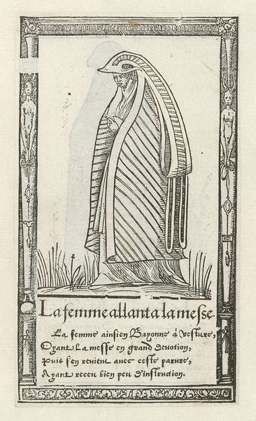This image, made by François Desprez sometime between 1500 and 1600, is a woodcut representing mourning attire from Bayonne. The figure is defined by the linear marks incised into the woodblock, a process requiring careful control and a sharp cutting tool to achieve the contrasting hatched effect that simulates shading and depth. Woodcuts, unlike engravings, necessitate the removal of large areas around the lines, leaving the design raised. This is a laborious process that often involves teams of artisans, pointing to a system of labor and production. The stark contrast between the ink and paper further emphasizes the heavy, enveloping fabric, underscoring the somber mood associated with mourning. Consider how the very material and method employed—wood and carving—contribute to the image's solemnity and graphic impact. By attending to such processes, we recognize the intersection of craft, art, and social context, highlighting the importance of modes of production in our understanding of cultural artifacts.