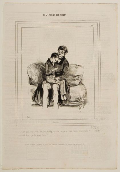 Editor: This is "Upon receipt of this letter . . ." by Paul Gavarni, from about the mid-19th century. It looks like a lithograph. The figure seems really dejected. What can you tell me about the context of this image? Curator: Gavarni was known for depicting Parisian life, often satirizing social mores. This image reflects the anxieties and complexities of urban existence. Notice the letter, the crumpled paper – what social narratives do these visual elements suggest to you? Editor: Maybe something about broken promises or scandal? The discarded letter made into a child's toy hints at some disruption. Curator: Precisely. Gavarni used prints to reach a wide audience. The political implications of social commentary circulated more freely because of them. Editor: So it’s not just a sad portrait, but a commentary on social issues, made accessible through printmaking. Thanks! Curator: Yes, the piece reflects and shapes public opinion. It is interesting how the artist chose this scene to show this.