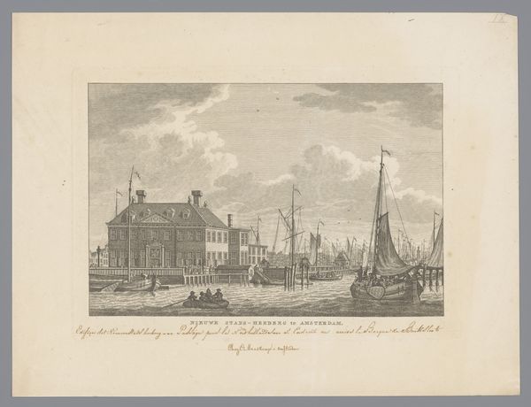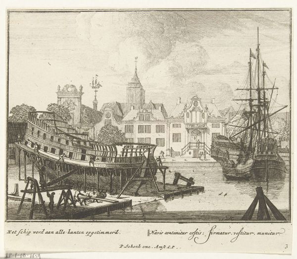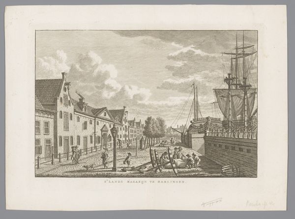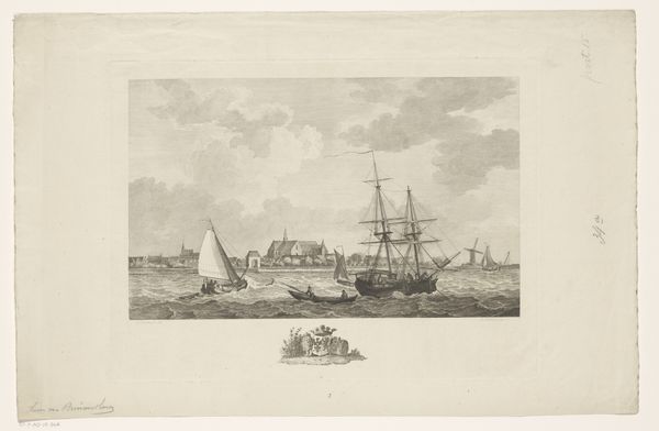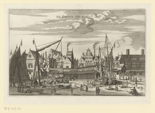Jan Caspar Philips created this print of a section of the harbor of Vlaardingen during the 18th century, using etching and engraving techniques. Philips documented the dynamic port city, capturing its architecture and maritime activities with great detail. This print provides a glimpse into the economic and social life of the Dutch Golden Age. The detailed depiction of the fish market, harbor bridge, and city crane illustrates the importance of trade and maritime infrastructure. Notice the subtle class distinctions in the figures populating the scene – merchants, laborers, sailors, and other individuals, all integral to the harbor's economy. Their presence weaves together the diverse experiences of those whose livelihoods depended on the sea. By focusing on the everyday life of the harbor, Philips offers a snapshot of a society shaped by trade, labor, and the ever-present sea. The print serves as a reminder of how deeply economic activities are intertwined with individual lives and community identities.