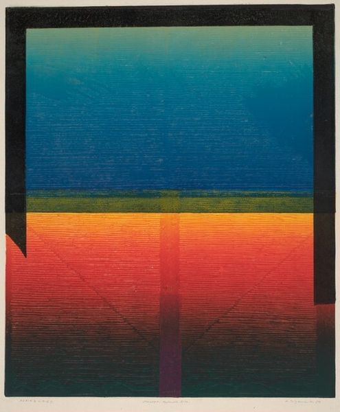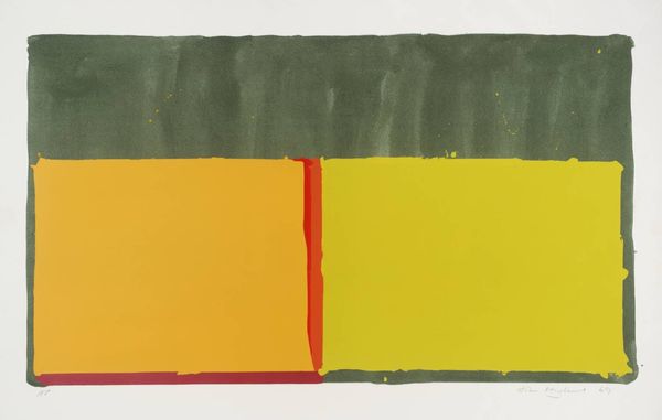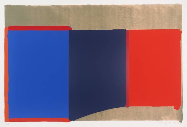 Doug Ohlson made this painting, called Peep Show, using what looks like thinned-down acrylic paint to create some blurry shapes. I love the way the colors bump up against each other: that chalky blue, the bright orange, and then, BAM, a big black rectangle. It’s like a stage set, and those red bars feel like curtains—or maybe prison bars? Something's going on here, right? The paint isn't trying to hide itself; you can see the strokes and the way the colors bleed into each other, especially around the edges. Look at the black area, which is not a perfect rectangle. I get the sense that Ohlson made some choices but let the paint do its thing. It reminds me a bit of some of the color field painters, like Rothko, but with a bit more funk and a wink. It's serious, but it's not *too* serious, you know? Ultimately, I think this is a piece that is open to our interpretation, and I like that about it.