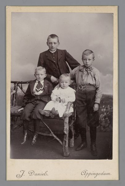 Curator: Looking at this piece, the immediate thing I notice is how subdued and carefully constructed the entire tableau seems. There is a somber air about it all. Editor: Indeed. What we have here is a group portrait of a family with two children, taken circa 1897. The image, created through photography, comes to us from H. Sanders & Co. Curator: I’m struck by the rigidity of the sitters. Their formal poses and the composition with plants arranged across the bottom create a very deliberate sense of status and formality. Even the plants serve to indicate cultivation, control… social standing, perhaps. Editor: You’re keying into something essential about the 19th century. This era witnessed the rise of studio photography, a shift in accessibility driven by technological advancement and changing class structures. The portrait became less about the individual and more about communicating the idea of family. Curator: So, this wasn't simply a family photo; it was a deliberate display of societal participation. Editor: Precisely. Consider the material constraints. Long exposure times meant sitters had to remain still, hence the stiff postures. It wasn't necessarily a natural representation, but a performative one, crafted and negotiated. We should note also that the photograph’s inherent reproducibility aided greatly in the distribution of such ideals, cementing societal norms via repeated exposure. Curator: The props too – the patterned fan, the potted plants – speak to bourgeois aspiration and interior decoration, a crafted image for the social record. The dark garments of all the members certainly underline the gravitas in taking a portrait. Editor: The circulation and reception of such imagery within a broader cultural context reinforces prevailing values and power structures. To understand its complete value, one has to place it alongside popular illustrations and mass-produced print, and analyse the intersection. Curator: The family group photo itself almost becomes a commodity in this setting, reproduced, exchanged, and consumed as a marker of social belonging. It is an artifact created by laborers and companies for mass dissemination. Editor: Examining this artwork, we appreciate it as an interesting example of production shaped by historical forces. Curator: It gives us an interesting insight on the deliberate creation and social performance in 19th century studio photography.
