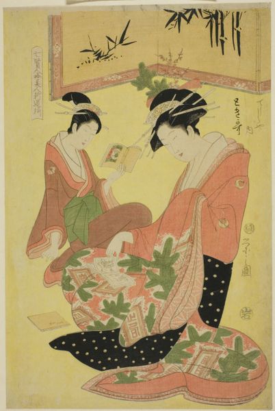 Curator: Welcome. We are looking at "Beauties Parodying the Seven Sages - A Selection of Younger Courtesans (Shichi kenjin yatsushi bijin shinzo zoroe): Shinoura of the Tsuruya," a color woodblock print crafted around 1793 by Chōbunsai Eishi. It resides here at The Art Institute of Chicago. Editor: I adore this! There’s a subtle grace, like catching a candid moment between performances. And that muted palette creates such a dreamy atmosphere. What strikes you first? Curator: Definitely the craftsmanship of the Ukiyo-e technique, particularly regarding the production and the implications it had for art accessibility at that time. Color woodblock printing democratized image consumption on an unprecedented scale! Also, considering Eishi's noble samurai background and later decision to renounce it, it makes you wonder how class dynamics of production played a role. Editor: Hmm, I see your angle! For me it is more visceral. Those flowing lines composing the garments—they practically whisper stories! Note the positioning of the doll - is it simply a plaything, or something more? There’s such tenderness between the women and the object, almost an anticipation of some coming-of-age realization. Curator: I'd suggest that this relates more to material circumstances within social codes. Remember that these women inhabited the pleasure quarters. Every fabric, ornament, even the print itself served within a structured system defining status, value, labor investment, which could be calculated and used or devalued. This interplay would certainly play a vital role in their perceived worth. Editor: Right, their costumes signal an active manipulation of societal value markers…yet on some level, maybe this staged moment hints towards hidden emotional ties? Or a subversive wink at accepted views of courtesans' lives, possibly challenging stereotypes regarding the women that society generally tends to strip any personal depth? The parody itself seems designed to poke holes in societal presumptions, but of course that all exists within a consumer relationship. Curator: Absolutely! It's complex, right? And while it represents a world seemingly separated, it was fully immersed and formed by everyday market exchanges and power struggles in late 18th-century Edo. That these very visible women and the production process intersect makes this artwork worth a close analysis! Editor: Fascinating. Viewing it this way offers a wider sense for its social existence and artistic fabrication while hinting subtly to a certain psychological insight, wouldn’t you agree? Thanks for that point of view.