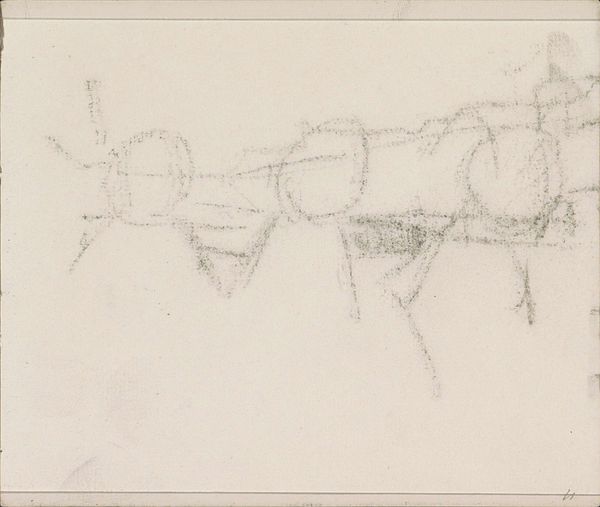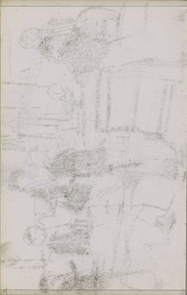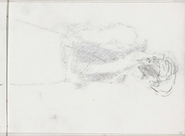Editor: This is Isaac Israels' "Abklatsch van de krijttekening op blad 21 verso," made between 1875 and 1934. It's a drawing done in pencil and graphite, currently housed in the Rijksmuseum. It strikes me as incredibly delicate, almost ephemeral in its execution. What catches your eye in terms of its structure? Curator: Immediately, the dynamism of line becomes apparent. Observe how Israels employs varying pressure to articulate form, moving from barely-there wisps to areas of dense, almost chaotic scribbling. These heavier patches, situated predominantly on the right, serve as a tonal anchor, a visual counterweight to the lighter, more ethereal qualities dominating the composition's left quadrant. Consider, how does this use of contrasting densities shape our perception? Editor: It does give a sense of depth and weight. The contrast between the defined and undefined creates visual interest, and suggests maybe movement, or even a passage of time within a single image? Curator: Precisely. It presents us with an image pregnant with potential. What strikes me is the near abstraction achieved despite the clearly figural suggestions. The pencil, rather than defining with crisp boundaries, operates more sculpturally. He allows the medium itself to generate form and atmosphere. This approach prefigures a lot of the modernist ethos, wouldn’t you agree? Editor: Definitely, now that you point it out. I hadn't considered its modernist implications so explicitly, but seeing the interplay of form and medium as the primary focus makes it clearer. Thank you for the illuminating analysis. Curator: My pleasure. Appreciating its formal mechanics really unlocks further potential in it.