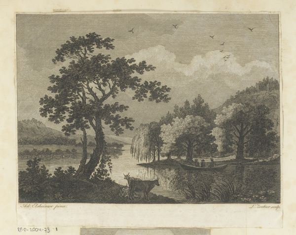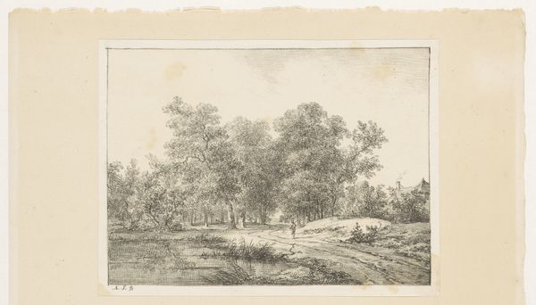 This is "Stags in Woods," an etching by Charles François Daubigny. The print presents a landscape scene, dominated by a dense arrangement of trees and a reflective body of water, all rendered in monochromatic tones. The composition’s success lies in the strategic arrangement of light and shadow. Daubigny’s approach to landscape involves an interplay between meticulous detail and suggestive form. Look at how he uses the etching technique to create texture, especially in the foliage and the reflections on the water’s surface. The forms of the stags are subtly integrated, almost camouflaged within the broader scene. Daubigny was part of a movement shifting away from idealized landscapes toward more naturalistic and immediate depictions of nature. "Stags in Woods" serves as a moment captured, one that invites us to consider the formal properties of line and tone and how they converge to create an atmosphere. Like language, the image offers an open field for interpretation, inviting continued analysis.