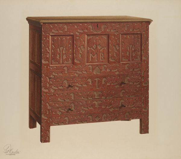 Curator: Here we have Lawrence Flynn's "Hadley Chest," created in 1937 using pencil, colored pencil, and wood-carving techniques. The piece presents a meticulously rendered chest of drawers. Editor: Wow, it has such a dreamy quality! The monochromatic palette creates a quiet sort of energy and that intricate foliage carving suggests a storybook forest. It reminds me a bit of childhood fantasies about finding hidden treasures in Grandma's attic. Curator: It’s interesting that you perceive the foliage as storytelling elements. Flynn seems to prioritize decorative patterning, using consistent repetition of shapes, from the floral medallions between the drawers to those stylized tree motifs above. Notice how the consistent use of line and color unify the composition across varied planes of depth. Editor: Absolutely! But I think those trees hint at a deeper symbolism— maybe a connection to ancestry and the passing down of family lore? The decorative art style suggests a functional purpose, yes, but also that whoever owns it deeply cares for art and artistry itself. Like it holds ideas as well as objects. Curator: It's tempting to dive into potential symbolism, though the essence is the construction— observe how he renders the drawer pulls and carved surfaces with almost hyper-realistic precision; and this enhances the piece’s overall spatial integrity. This rendering emphasizes its physicality and grounded-ness despite its ornamental touches. Editor: Still, imagine keeping precious memories locked inside… photographs, letters. All safely kept inside a sort of ornamental heart. This rendering certainly pays homage to the idea that even in everyday utility, we discover sacred echoes from the past and present both. Curator: Perhaps your sentiment gets to the essence, although indirectly, through the materiality. By marrying the artistry of wood carving with drawing media Flynn produces an object with conceptual as well as tangible merit, so our perception has layers. Editor: I guess Flynn has invited us into the realm where history sleeps but can easily waken. What a fascinating artist, such details in functional objects; one could simply admire such intricacy or be deeply touched by the stories it may hold.