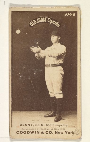 This photograph of Jerry Denny, 3rd Base, Indianapolis, was produced around 1887 by Goodwin & Company as part of the "Old Judge Cigarettes" series. The sepia tones lend a nostalgic air, focusing our attention on Denny's poised stance and the clean lines of his uniform. The composition is carefully structured. The foreground is distinct from the background, placing Denny as the focal point. The diagonal line of the baseball bat creates a dynamic energy, contrasting with the stability of his grounded posture. It encourages us to consider the semiotic function of this figure. His uniform, emblazoned with "Indianapolis", transforms him into an emblem of the team and the city. The "Old Judge Cigarettes" inscription reminds us of the cultural context of the late 19th century, where commercial and sporting interests intersected. The photograph is not merely a portrait, but a cultural artifact. Its formal elements reflect broader themes of identity, commercialism, and the construction of celebrity within the burgeoning world of professional sports.