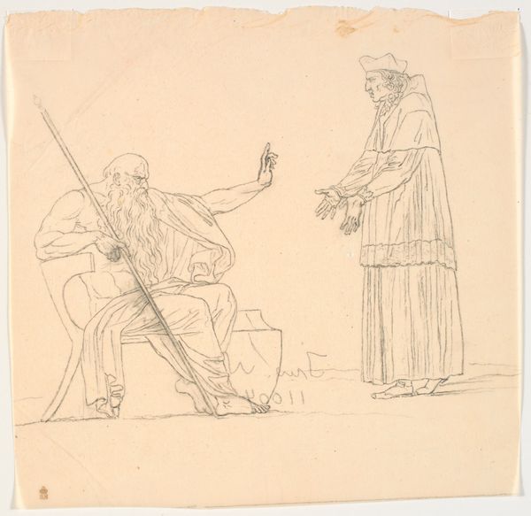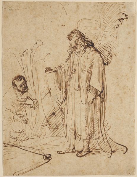 Curator: This intriguing drawing, “Three Standing Figures (recto); Seated Woman and a Male Hermit in Half-length (verso)” is attributed to Stefano da Verona and dates back to the years 1435 to 1438. Crafted with ink on paper, it’s currently housed here at the Metropolitan Museum of Art. Editor: The initial impression is one of contemplative isolation. There is something both delicate and somber about the wispy lines and the quiet postures of the figures. I immediately find myself considering how these depictions might challenge conventional Renaissance notions of gendered humility. Curator: Precisely. Note how Stefano's deliberate portrayal invites an exploration of societal roles. We can view the figures not just as individuals but as representative of broader societal narratives and hierarchical structures present in 15th-century Italy. How might their physical bearing reveal the complex negotiation of identity in a heavily patriarchal society? Editor: Right, and consider the paper itself. Paper in the 15th century was becoming more available, yes, but the act of drawing with ink would have required a mastery of craft. What stories are embedded in the production of the support for the work as well as the tools for producing it? The scarcity of the paper gives a certain value to the drawing itself, regardless of subject matter. Curator: Absolutely, this impacts how the drawing would be viewed in its own time. Furthermore, the apparent vulnerability and tenderness of these individuals contrasts sharply with expectations surrounding depictions of women and hermits in the early Renaissance. Consider that the woman depicted, gazing toward something we can not see, could represent a new kind of subject that challenges rigid gender roles and embraces female interiority. Editor: Interesting thought. What really gets me thinking is how the figures' robes and clothing are represented by such thin, close line work. What processes informed the decision to foreground line, an agent of division, over modeling, a process more capable of unified tonal masses? I feel it challenges some modern views about value. Curator: It is truly remarkable how much discourse emerges from one single sheet. This detailed examination invites critical reassessment of prevailing notions. We can no longer ignore the rich tapestries of cultural and historical intersections in artworks. Editor: The intersection between means, labor, and material creates new avenues of thought about a society so far away. The piece is simple in its way, but a strong reflection of our moment, too.