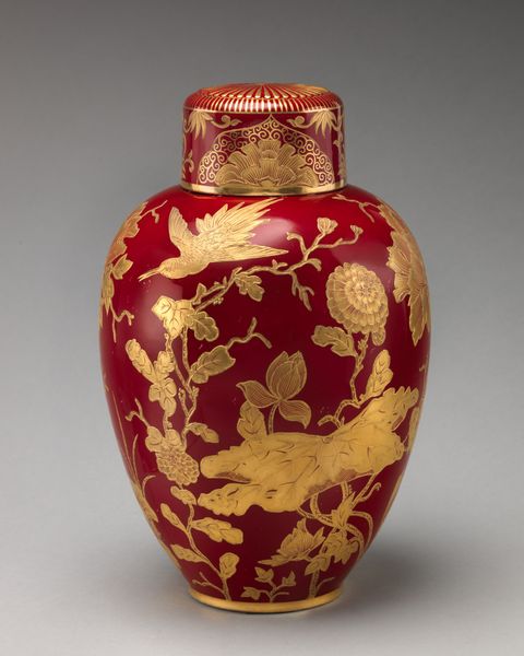 Curator: Looking at this vase from the late 19th century, likely between 1882 and 1890, it really does evoke a certain dreaminess, doesn't it? The makers are Ott and Brewer. Editor: Dreaminess is right! It's giving me sunset vibes, all hazy pinks and shimmering gold. Is that... a dandelion theme happening? Curator: Indeed. It's ceramic, adorned with golden dandelions and a bird—perhaps a crane—soaring amidst fluffy, gilded clouds. Note the handles, they are delicately crafted with what appears to be pierced floral designs. It resides in the decorative arts collection at the Met. Editor: Pierced floral designs - that level of detailing is amazing. What's particularly striking is how functional this beautiful vase actually is: it looks fragile but feels like solid material expression with skilled craftsmanship involved, don’t you think? Curator: Absolutely. Ott and Brewer were significant players in the American art pottery movement, focusing on merging beauty with everyday objects. They drew inspiration from nature and this vase, I feel, it exemplifies the ethos of the Arts and Crafts movement so well. Editor: Right, and looking at it from a materialist point of view, the firing process would have been crucial to achieving that ethereal pink hue, right? The intense labor involved in producing the gold decoration is equally compelling; I mean just look at the bird’s individual feathers! This vase encapsulates the ideals of handcrafted beauty in a late industrial world. Curator: I’m with you, and I find the choice of dandelions quite evocative as well, because in their ephemeral nature, there's something profoundly hopeful; a cycle of growth, decay, and renewal mirroring the journey of life. And placing the scene in ceramic—the ultimate medium of everyday life and functionality. How intriguing? Editor: Absolutely intriguing. When considering the vase through a lens of material production, it brings attention to class dynamics and aesthetic preferences in that time. Now it prompts reflections on our relationship with nature and value in art, whether ‘high’ or ‘applied’, doesn't it? Curator: Exactly! The bird in flight seems to carry the viewer on a journey that intersects the natural and the artistic—a harmonious blend of meticulous crafting and imaginative expression. Editor: Very beautifully said. Looking at the way art manifests and gets embodied in these vases is absolutely revealing.
