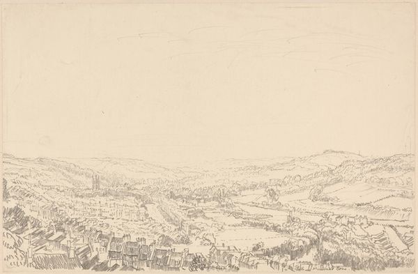 Curator: The vista before us, titled *View of the Rhine River Valley*, was captured by Aelbert Cuyp between 1651 and 1652, executed delicately in pencil. Editor: It's evocative, almost dreamlike. The way Cuyp uses light and shadow, creating an ethereal atmosphere. Curator: The tonal range certainly guides our eyes across the composition, moving from the foreground figures towards the detailed cityscape in the distance. It’s carefully structured. The towers punctuate the skyline with intention, wouldn’t you agree? Editor: Intention, certainly, but also a document of a moment. Look at the visible strokes, the apparent haste, which suggest immediacy of the material record and conditions during its creation. Those strokes indicate Cuyp rapidly captured the image. Did the laborers of the surrounding community also stop what they were doing to gaze in the distance? Curator: It would appear that Cuyp valued visual accuracy, observing details of built form and geographical features, but the drawing seems primarily to present a study in light. Note the perspective: The diminishment of size indicates spatial recession, producing a view from a slightly elevated position—giving a compositional foundation to consider all of the buildings equally, so nothing overlaps or appears confusing. Editor: Yes, I think about where the material comes from. From what mine were the materials extracted? What conditions did those workers endure? We can trace these histories back to the paper and the drawing, if we care to investigate them. Curator: And that is the power of this image—this simple pencil drawing allows us access to the Dutch Golden Age. Its understated presentation opens up volumes. Editor: Ultimately, by thinking of material, we can connect artistic decisions, labor conditions, and political factors across eras. Thank you for focusing our attention on those artistic decisions today.