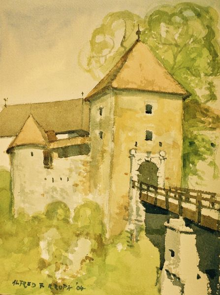 Editor: This is Theodor Pallady's "Eglise de Mimizan," created in 1937 using watercolor and pencil on paper. It strikes me as both delicate and a little lonely, with that church tower looming over the muted landscape. How do you interpret this work, considering the period in which it was made? Curator: I see a layering of histories within this seemingly simple landscape. Consider the role of the church, especially in 1937. Was it a place of solace, a symbol of oppressive power, or simply a backdrop to daily life in a world hurtling toward war? Pallady's loose Impressionistic style softens the architecture, blurring the lines between the institution and the community it served – or perhaps failed to serve. The delicate medium also speaks to the fragility of peace and the impending social upheaval. Editor: So, you're suggesting the style itself carries a kind of commentary? The looseness hints at instability? Curator: Precisely. The very act of sketching, of capturing a fleeting moment in watercolor, moves this beyond a simple architectural study. It asks us to consider what structures, both physical and societal, were being questioned and reshaped during this time. Were traditional institutions such as religion about to crumble like the fading edges of the watercolor washes? Editor: That’s fascinating. I hadn't considered the instability suggested by the technique itself. It gives a completely new dimension to the “loneliness” I initially felt. Curator: Art allows us this unique space, doesn't it? It lets us view historical events from oblique perspectives, encouraging us to challenge dominant narratives. What began as a landscape becomes an inquiry into the social and political fabric of its time. Editor: Thank you; that's a powerful reframing of this piece for me. It has provided such a thought-provoking look at the intersection of art and societal change.