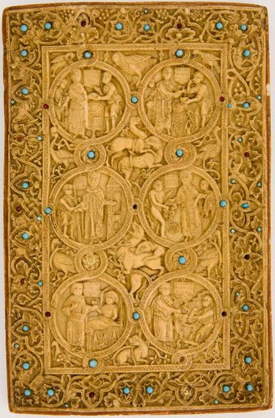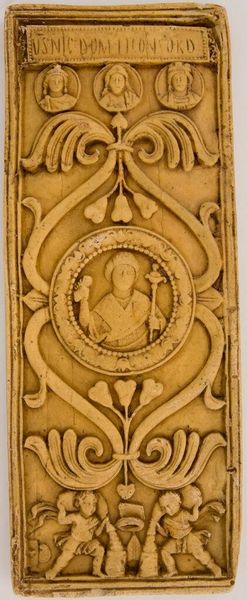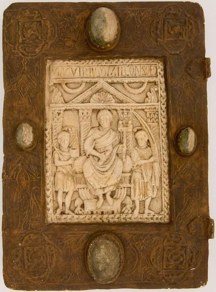 Editor: This small, unsigned piece, "Baptism of Christ," really draws the eye. The composition, contained within what seems like an architectural frame, feels dense yet balanced. What strikes you most about the formal elements at play? Curator: The dense, layered composition compels close examination. Note the interplay of vertical and horizontal lines, subtly reinforced by the architectural framework. The artist uses a restricted palette, focusing our attention on the tactile qualities of the material and the modulation of light and shadow across the sculpted surfaces. Editor: So, it's the texture and the arrangement that truly define it, even beyond the religious subject matter? Curator: Precisely. The figures, while representational, are primarily vehicles for exploring formal relationships. Consider how the drapery folds create a rhythmic pattern that echoes throughout the relief. It is a study in form and light. Editor: I see what you mean. Paying attention to the sculptural qualities first really changes how I perceive the narrative aspect. Curator: Indeed. By engaging with the formal elements, we unlock deeper layers of meaning within the work.