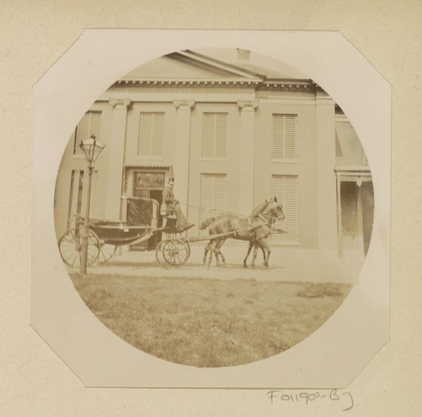 Curator: Allow me to introduce a photograph believed to be from the 1860s or 70s. Its caption identifies the subjects as Captain Matthews and Miss Johnson in a kariool in Drøbak, Norway. Editor: There's something quite immediate about this image. I am struck by the quiet composure and evident formality of this encounter. I’m very intrigued by the textures at play here--the polished carriage, the horse's fur, and the somewhat rigid outfits, everything suggesting a meticulous presentation. Curator: Yes, the photographer uses the limitations of the medium quite well, capturing texture in lieu of a broader tonal range. The architectural lines of the house are echoed by the crisp angles of the carriage. Semiotically, this pairing subtly reinforces the order and societal structures they represent. Editor: It makes me think about the material conditions required to create an image like this in the 19th century. The cost of the equipment, the processing...these would be members of a privileged class indeed. And how much of the work went into just wrangling the horse? Curator: Quite. We can analyze this by unpacking its symbolic structure: The horse, an obvious signifier of status. The somewhat tense pairing of captain and maiden on a clearly delineated social stage… all these reinforce established hierarchies. Editor: Precisely. Thinking materially, this would be one of relatively few visual records for them and others of that status at the time, compared to the working classes whose likenesses weren’t circulated in this manner. Also, how does the location, Norway, play into this visual narrative of wealth and leisure? It raises a question of representation that is difficult to extract given the technology limitations during its production. Curator: It’s difficult to see their expressions in this still life, which almost removes the personal touch and leans into structural representations. Though this image captures two distinct persons in a shared reality, its deeper value perhaps lies in portraying the greater constructs of societal structure in 19th-century Norway. Editor: In conclusion, examining "Kapitein Matthews en mejuffrouw Johnson in een kariool in Drøbak," shows how early photographic technology helped perpetuate social boundaries through materiality and careful subject selections. Curator: Indeed, this frozen moment becomes less about these individuals, and more about deciphering their roles within a precise societal ballet.
